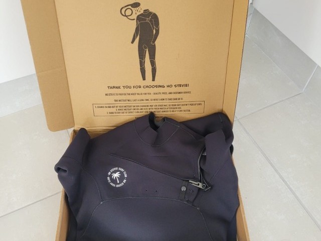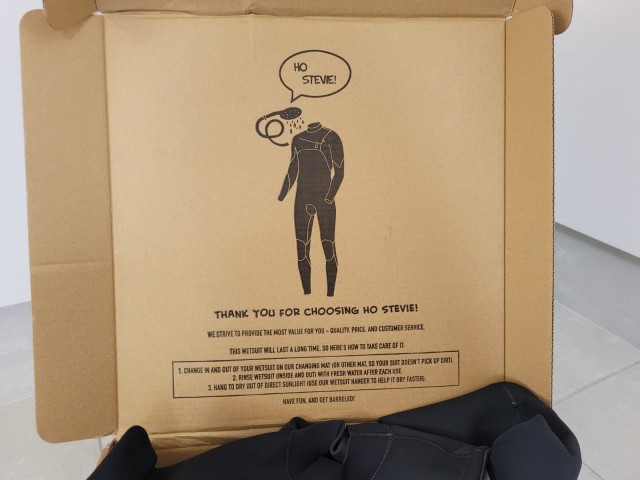 The 4/3mm wetsuit we ordered arrived in a flat cardboard box. Our first thought was, "Who ordered pizza?!" We quickly realised it was, in fact, the Ho Stevie! Surfing Wetsuit, arriving in a simple but effective box without unnecessary plastic packaging. It was great to see the little details on the back, including instructions on how to clean your suit and how to extend its life span.
