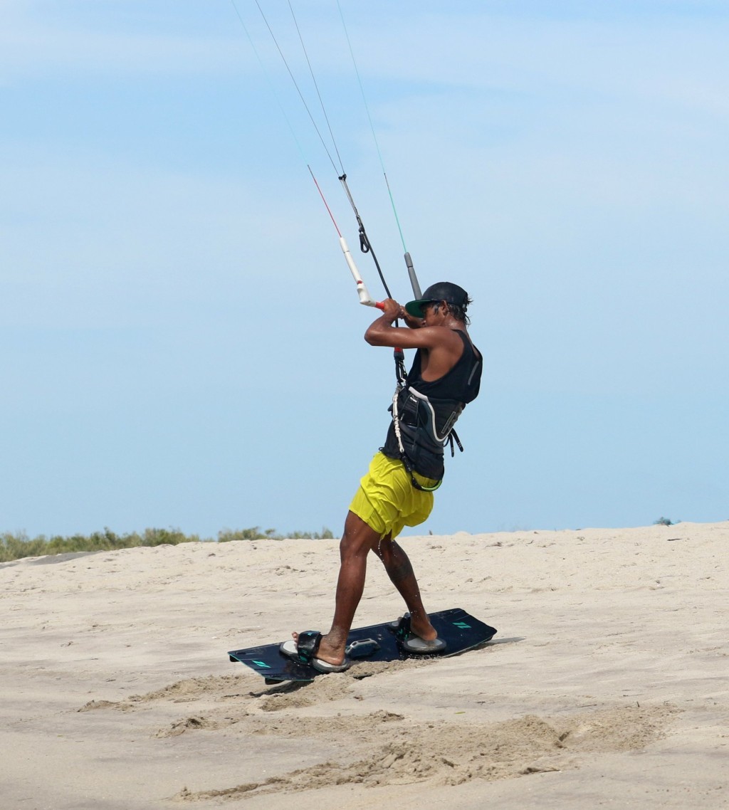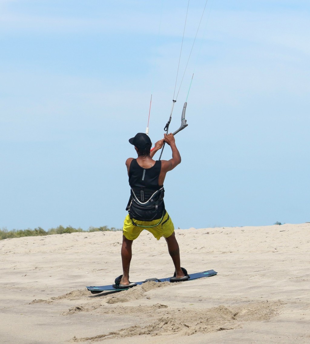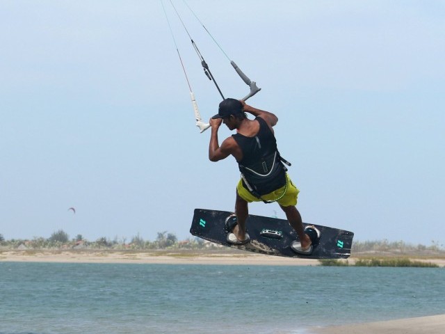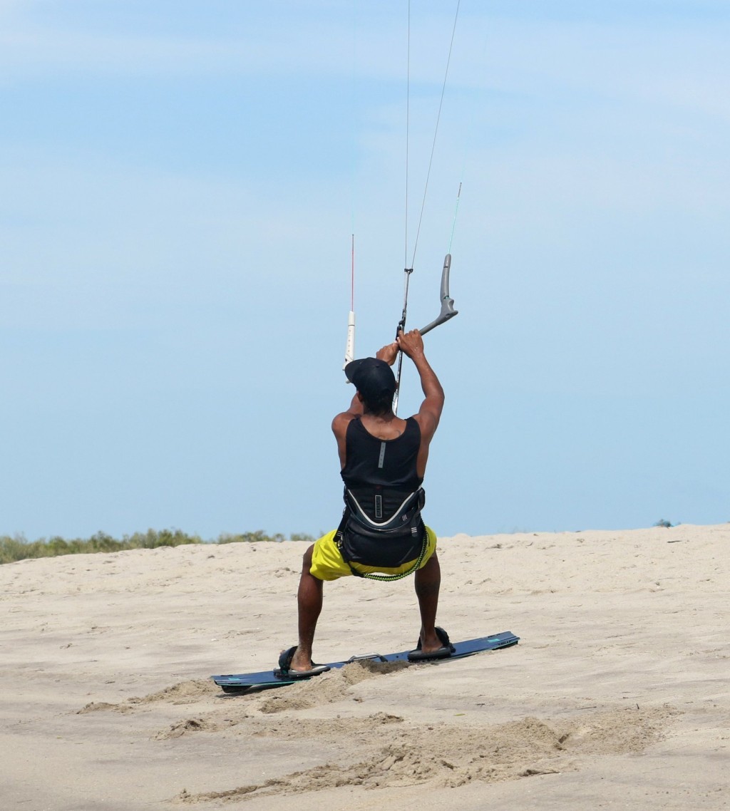 Set up for this remains the same as any beach jump start. With your board across the wind and kite at 12 o’clock you can step into the straps. Now drift the kite back slowly behind you, in this case to just past 1 o’clock. If you pull a little on the bar you should feel some pull as the kite drops deeper into the window. Wiggle your board so that you can comfortably lean gently against this pull. Now your board is in the perfect position for the jump, probably slightly further back than dead across the wind. Heliarde, is now ready he’s holding some power in the kite and has dropped his weight slightly to counterbalance it. To make sure he’ll get enough air, he has trimmed the sweet spot away and out and feels to make sure that there is enough power for this move. Weight should be balanced equally between your feet and the kite should have some pull even at standstill.