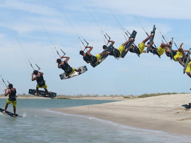To get off the beach and get your rotation going you need to be ready. Once the kite reaches 12, stamp hard off your front foot, kicking against the edge and upwind to keep tension on the lines, whilst throwing your head and shoulders towards the tail of the board, behind the bar. At the same time pull the bar in to get maximum lift and level it. This movement can feel counter intuitive as you’re exploding up whilst throwing the rotation against your intended direction of travel. Once again, if you’re on the edge of deep water with the wind blowing offshore you’ve got nothing to worry about. Here Heliarde has exploded up, adding height to the pull from the kite, whilst kicking himself towards the tail of the board, throwing his head and shoulders down and around behind the bar.