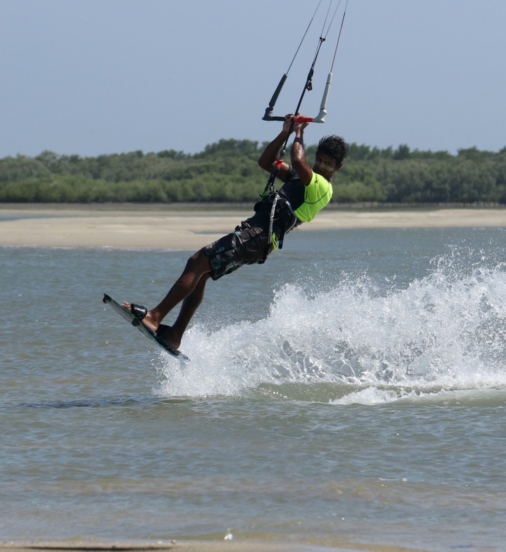 To get enough rotation you need to use your lower body and board to build momentum and help you round. As you’re pulling yourself up and over the bar, you must bring your back knee through and under it, effectively pushing the front of the board forwards and round. The action is similar to lifting one knee up and across your chest whilst standing. This is why you wait in toeside mode. It leaves your back leg ready and primed to assist when you need it. As the board comes through you can start to turn your head back, so that the shoulders can turn with the board. Heliarde is pulling, he’s bringing his back (right) knee through and he’s turning his head and shoulders away from the kite.