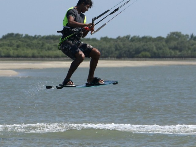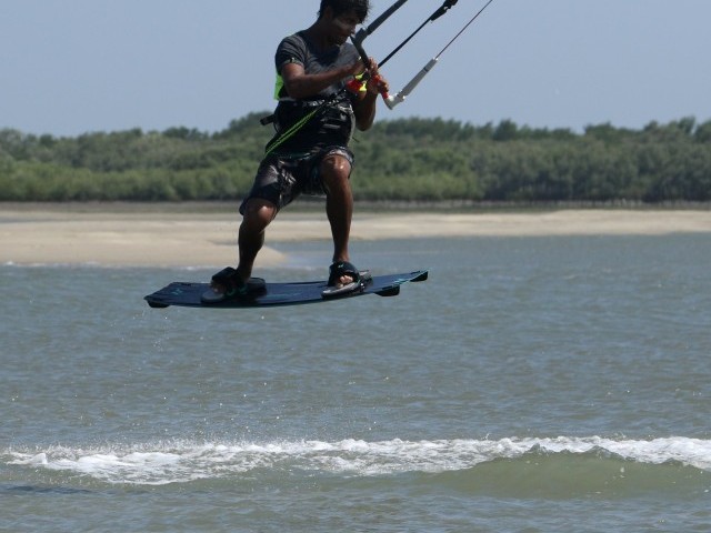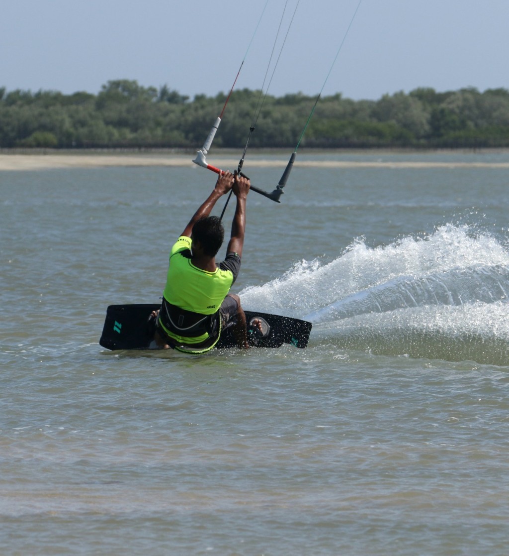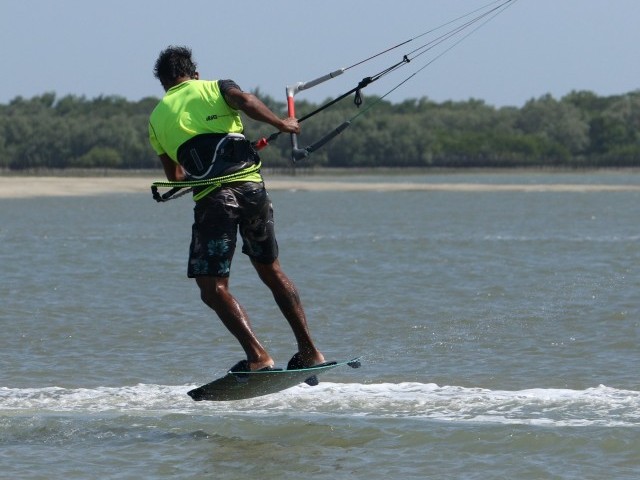 This is a low level move and a transition, so you won’t be needing bags of power or buckets of speed. You do need control of your kite and you still need to take off, so an edge and tension on the lines are musts on your approach. You won’t be giving the kite much of a send, more of a gentle drift up towards 12, you’ll do the moving a tad later. As the kite lifts it’ll try and pull you up off your edge, so keep your weight low and resist with all your might. And if necessary, feather the bar out to dump a smidgeon of power. It’s also good practice to keep your hands close to the centre of the bar because you’ll be pulling against it later. Glance over at Heliarde and you can see he’s got a decent edge, his kite is drifting up whilst he’s feathering the bar and keeping his bum low. This combo allows him to slow down but keep tension on the lines to lift off shortly.