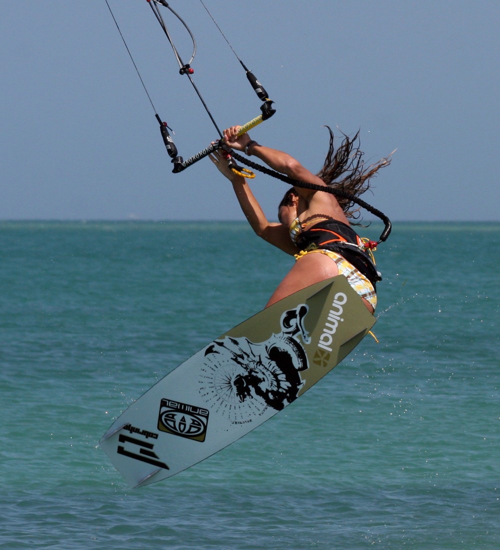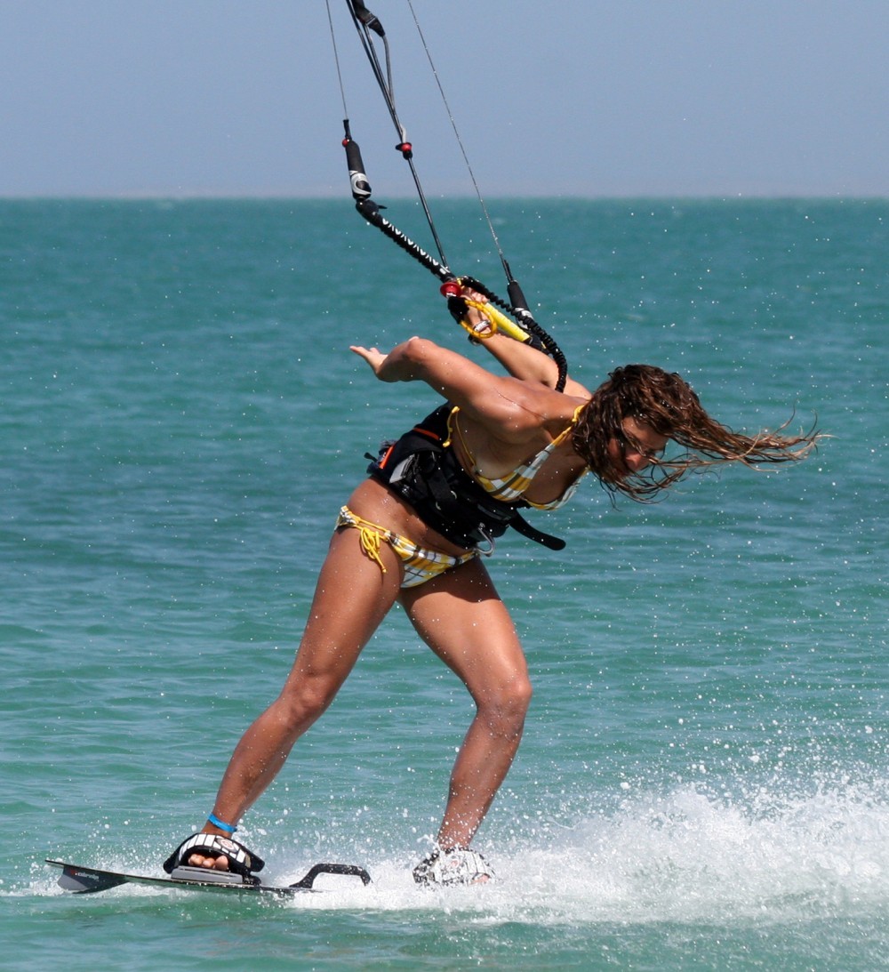 - Pic 7. Now it’s all change, Karine is on the way down and has decided that now is the time to throw it. If you look at Karine’s bar and hands, they are still travelling forward, however she has pulled the bar towards her and has twisted her hips, legs and board (her feet are there too) further. She has pulled her back leg up towards her bottom and will extend her front leg. This means that even if the board lands across the wind, it will pivot under her left foot and end up further off the wind. If both legs are straight she’ll just hit the water and stop.