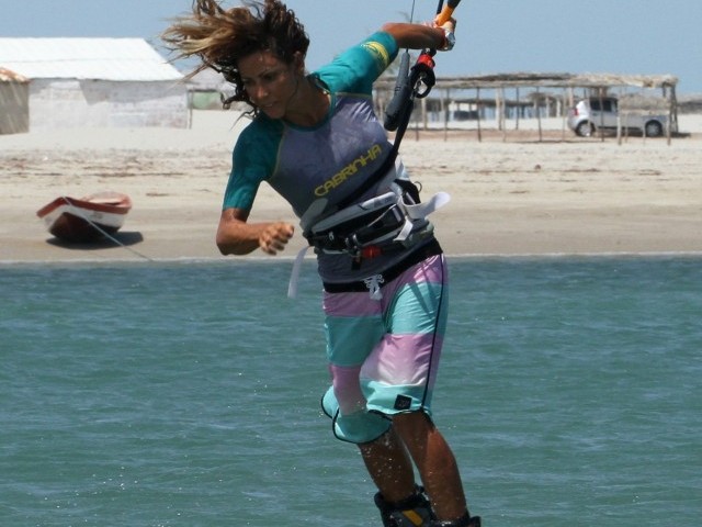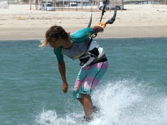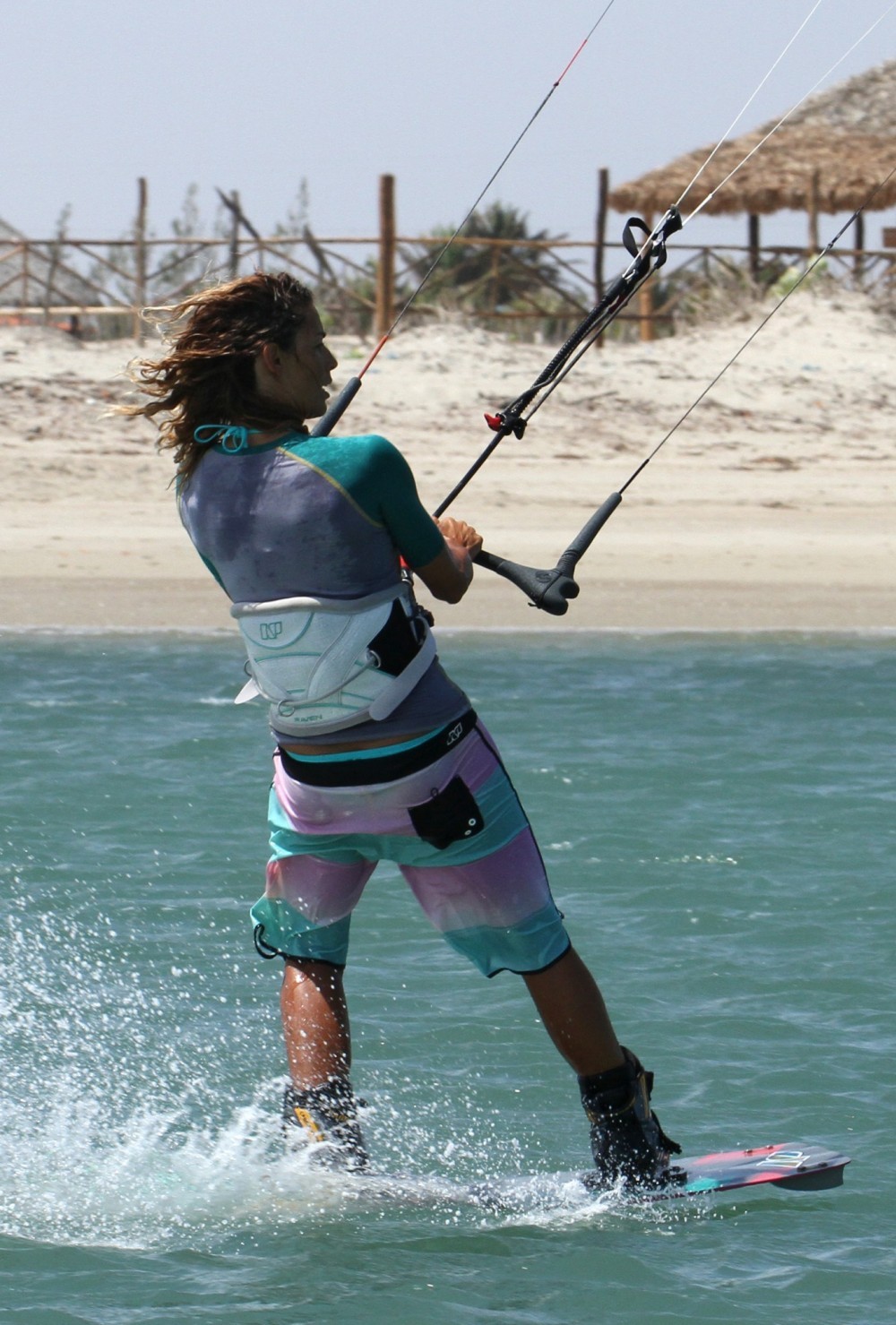 As with all things pop, your approach will determine how well things turn out. You can see in the picture that Karine has her kite just below 1 o’clock, she has turned the board off the wind onto a very broad reach, whilst keeping her weight both upwind of the board and back towards the tail of the board. Her front leg is extended and both her elbows are tucked into her sides, hands centred on the bar. Not only is this the perfect position from which to unhook, it is also the perfect set up for the Raley.