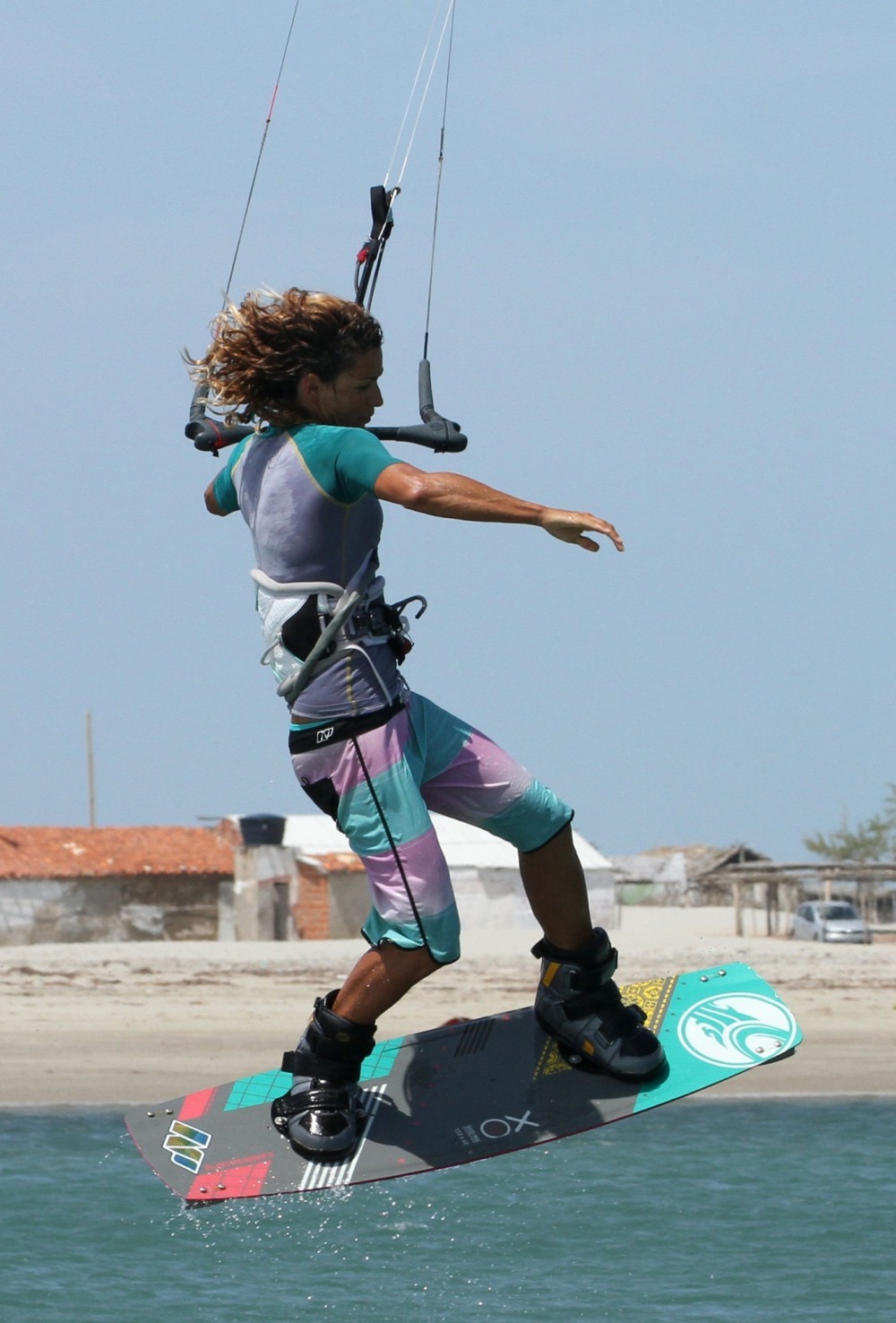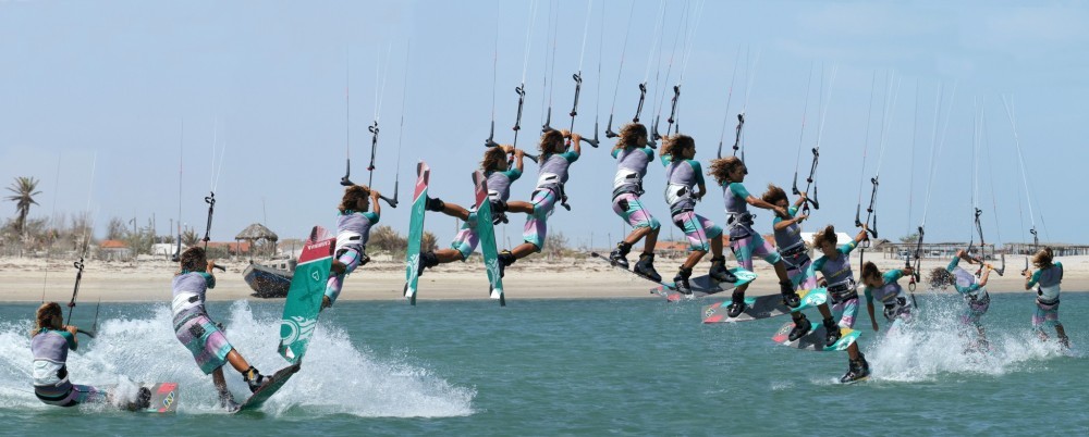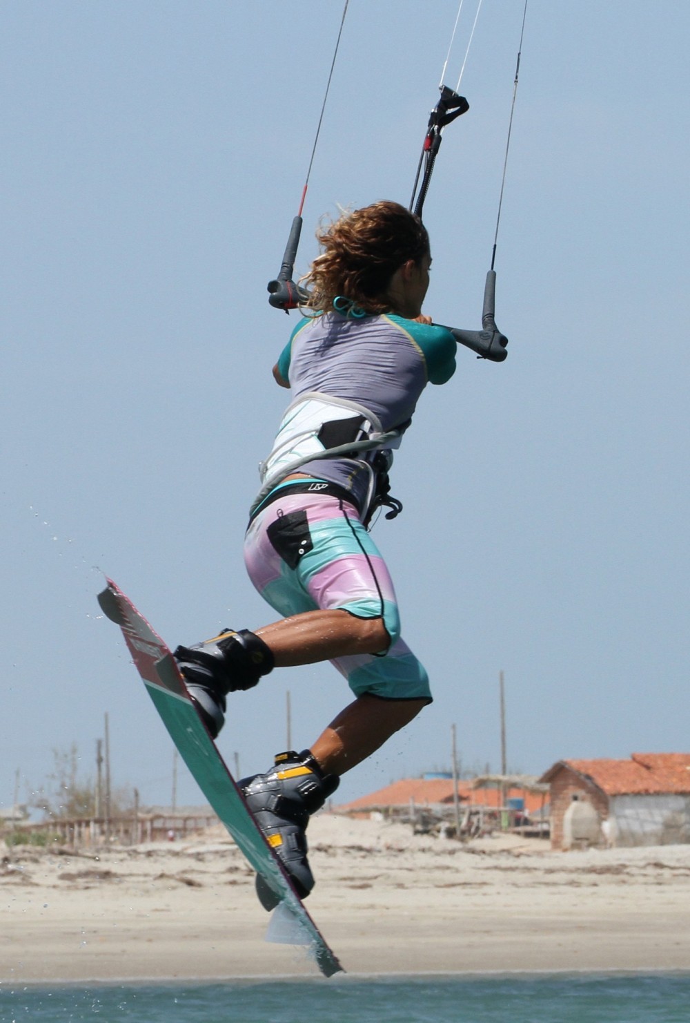If you’ve managed to resist on the aforementioned platform, you will be in a position to, and have something from which to pop. As the board turns underneath you it’s time to stamp. Karine feels the board turning under her, and more importantly feels herself being pulled forwards by the kite. This is her cue to pop. She pops hard against the board with her back foot by stamping down and extending her back leg as explosively as possible. Her front leg has remained extended throughout. The amount of pop you get will depend on a few variables – speed, power, timing, aggression, but your aim is to extend, really concentrate on straightening your legs, uncoiling the spring which is you. If the kite drifts up a bit during the raleyit’s no problem, as at least you’ll have more time to commit and rotate fully to wrapped. Thinking back to the Krypt, aim for a good flick off your raley too. You can see that as her front leg flicks around, it brings her back leg more forwards and closer to the bar, which will help.