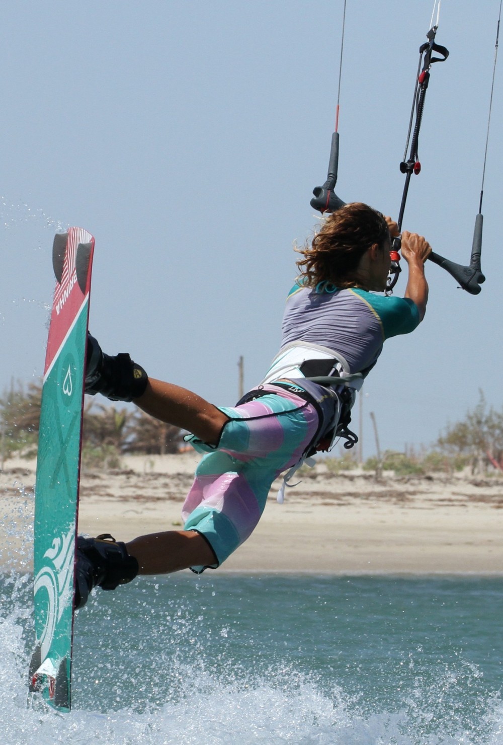 This is where the move gets critical. Commitment is your friend here. You must decide to go once your legs start to drop from the flick. If you wait too long you legs will swing down and you’ll land toe side. You also need to get your body compact and close to the bar so that you can land over the board and not get pulled downwind. This requires a sudden and extreme pull. You can see that Karine has pulled the bar towards her, which effectively pulls her up and towards the bar. She is till looking forwards and her shoulders are still turned as if she was going for toe side. Karine has also lifted her legs under her body and the bar, so that once she turns everything will rotate together. The pull must be done with both hands so that the kite doesn’t move. If you have a tendency to pull too much on the back hand, which is common, you can try and tweak the kite down by pulling more on your front hand.