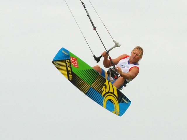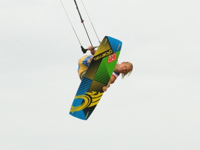 The Shifty part of this move is really the tweak to make it a bit more contorted and stylish. The idea being to twist the board even further around by twisting your front hip up towards the bar. Christian has the grab with his back hand, and to twist even more he drops his back shoulder and head, forcing his lead hip up towards his hand on the bar, almost scissoring his feet so that the front of the board is now pointing upwind. At this point Christian tweaks it further by extending his legs whilst holding the grab. As with any grab try to hold this until you feel that you’re coming down and the kite needs to be dived.