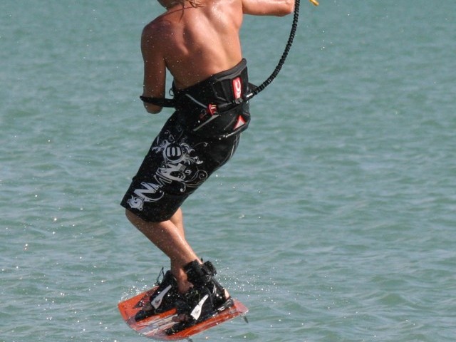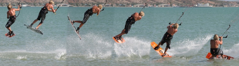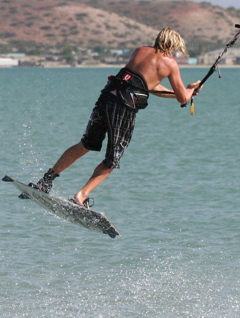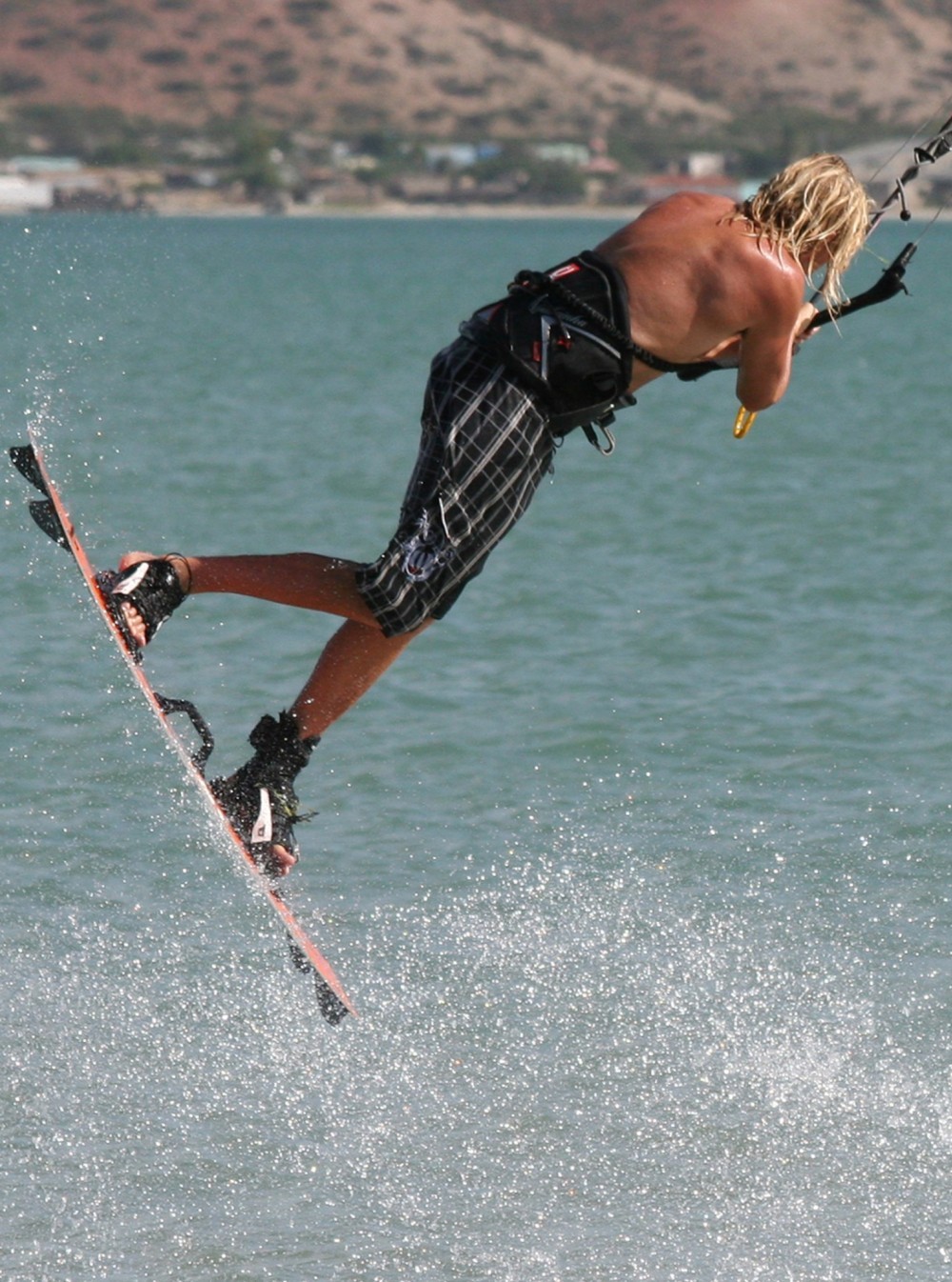 - Pic 3. With his weight over his back foot Christian allows himself to be pulled up and explodes off his back foot. Immediately he leans his head over his back arm and keeps his front leg extended. Because the kite is not too high his arms don’t get pulled up over his head.