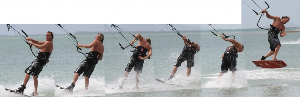 One final tip before we go through the sequence is to give the kite a hefty tweak down with your front hand as you pull in to get the rotation. The kite will want to rise as you’ll be left holding the bar with the back hand, so the only way to get this move smooth is to yank the kite down just before you spin. Once you get the timing right you’ll be able to pull the bar in hard but bias the front hand so that your pull steers the kite down.