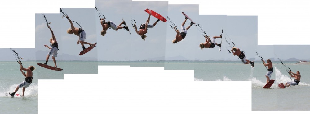 Pic B. As soon as you get airborne you need to throw you head and shoulders down over and past your front foot, as this will get you feet up. You can see how Christian’s shoulders and head are moving down and forwards into the rotation. Try and get your front ear to press on your front shoulder. Because his arms are bent he is in control of the rotation. Because you’ll be releasing with your front hand the kite does have the habit of rising as you pass. You can see here that Christian is actually steering the kite down with his front hand as he throws himself into the rotation. Initially this feels wrong, but even though the mind may find it a touch rad, it is necessary.