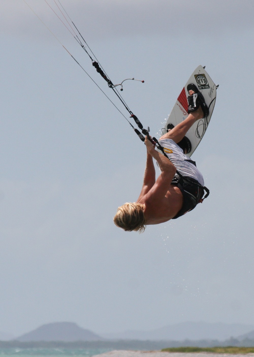 Pic C. As he rotates Christian lifts his knees. Your aim here is to try and get your right knee towards your right hand on port, or left knee to left hand on Starboard. By doing this not only do you get inverted, but you also guarantee that you rotate far enough to land cleanly. You may also notice that Christian has not turned his head heavily into the rotation as you may normally do. If you turn you’ll spot your landing too early and come around too quickly, so try and keep your head looking forward, perpendicular with your shoulders.