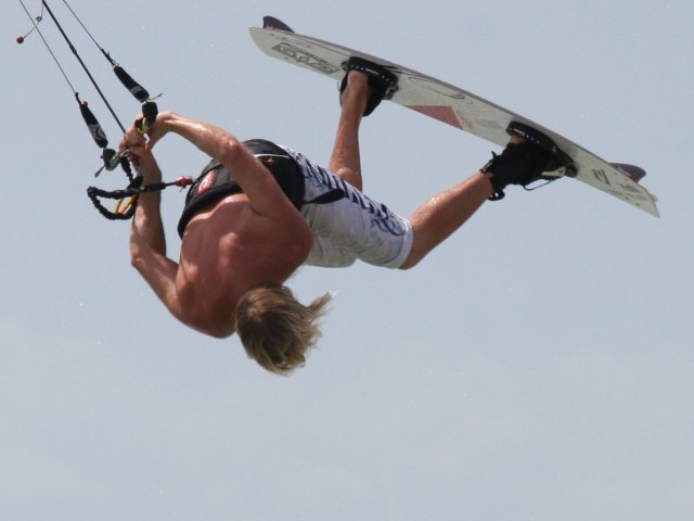 • Pic 3. He throws his head and shoulders down and around, all the time keeping his head facing forwards. Christian steers the kite down with his front hand.
