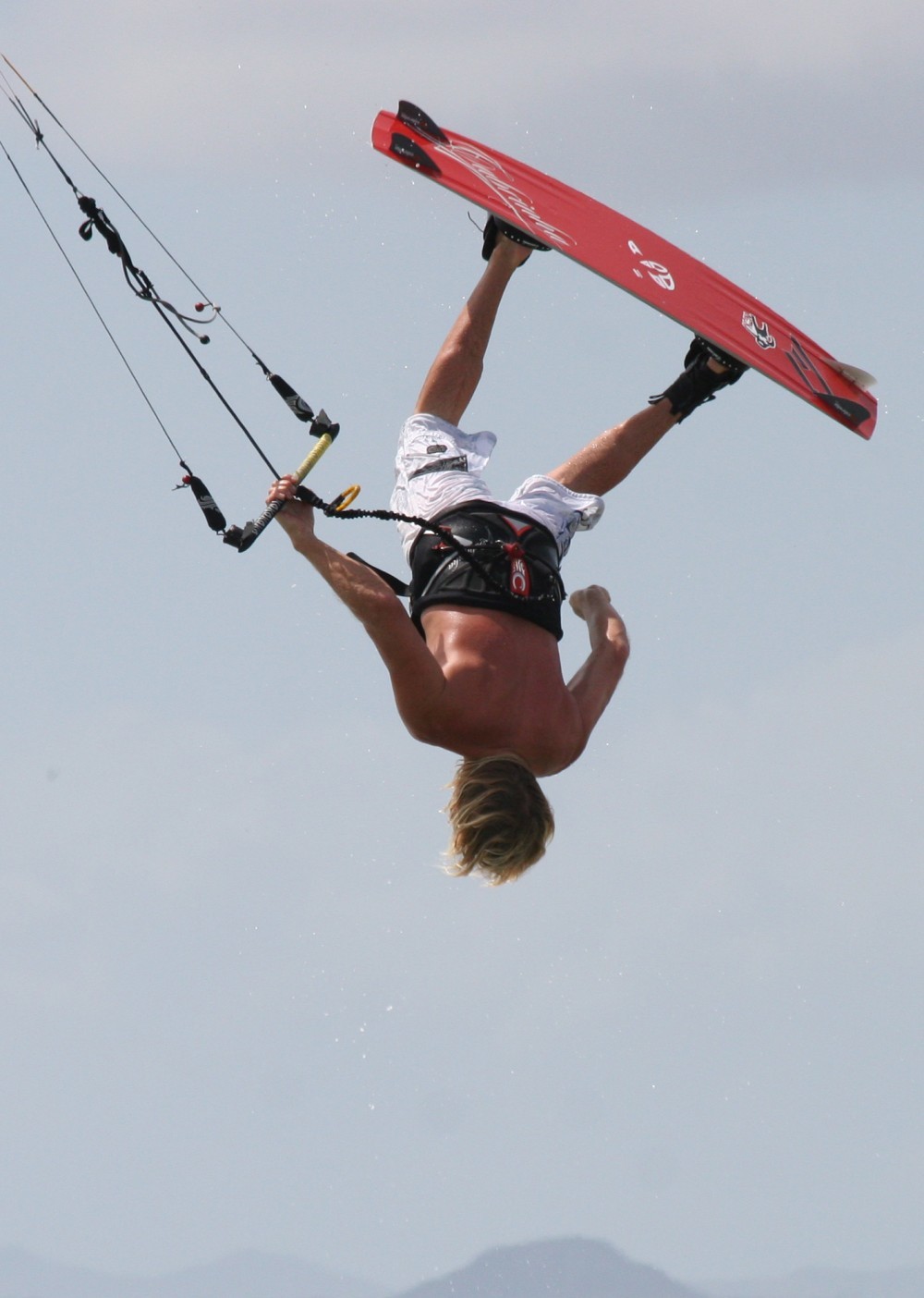 Your take off is vital if you intend to get inverted. In Pic A. you can see that Christian has edged super hard and has really stamped down off his back leg, having already gone off the wind. This physical popping is vital as it allows you to keep your arms in and head up near the bar. This will enable you to throw your head down and around, whereas if your arms where extended you’ll just rotate around the axis of the lines.