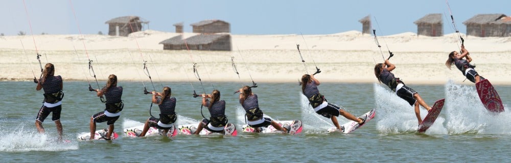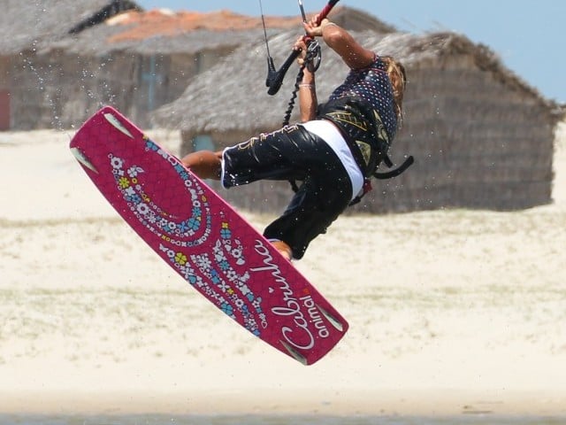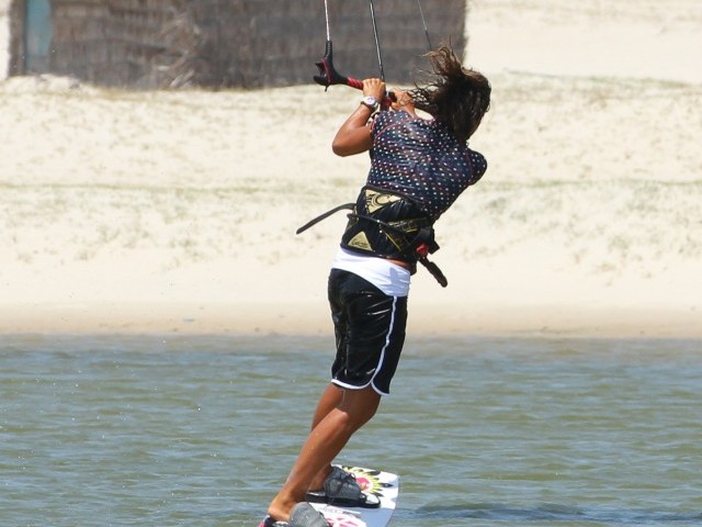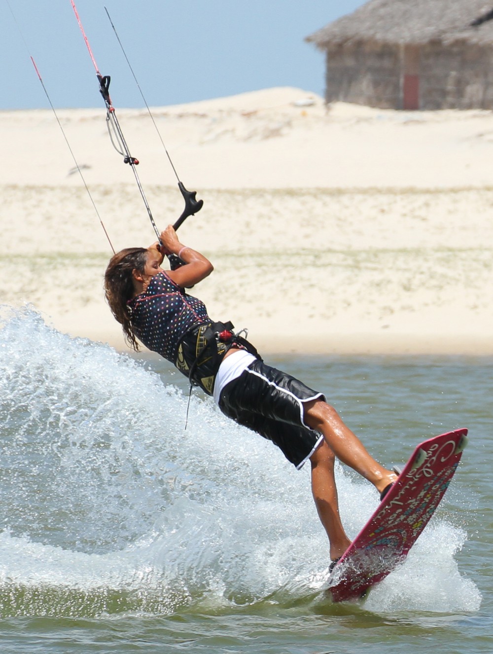 - Pic 4. As she drives the board onto its edge Karine locks her back leg to resist the kite and keeps her weight on both hands to stop the kite drifting up.