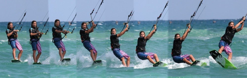 - Pics 5 & 6. She now pretty much forgets about the kite and drops back onto her edge, getting her weight low and carving the board hard back up wind.