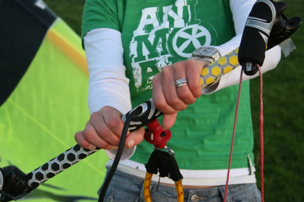 If you have a fifth line use it to attach your leash to. If you have a bow style kite that de-powers from the chicken loop make sure that you don’t have the stopper fixed in place. For learning this we really don’t recommend using a suicide leash (read the name).