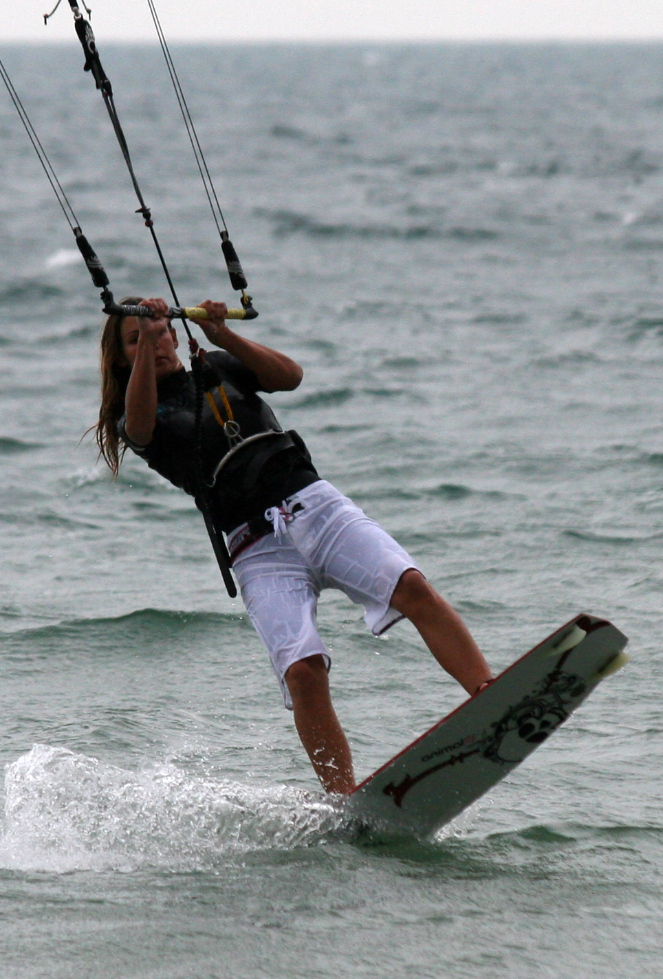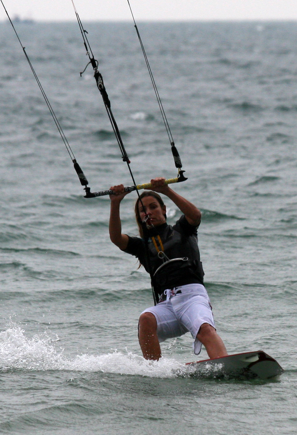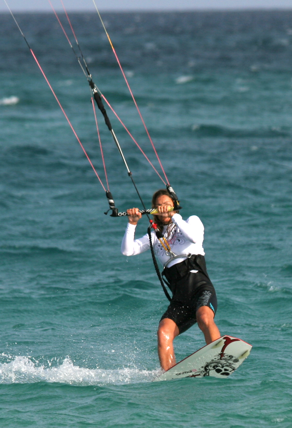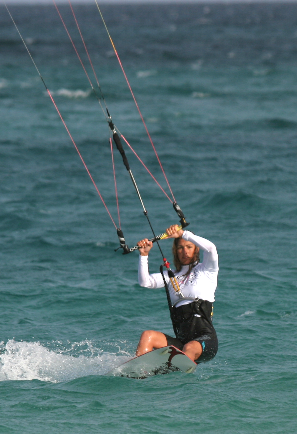 - Pic 7. With the nose of the board passing through the wind and the her knees coming up for balance you can clearly see how Karine is still directing the kite with her front (left) hand which keeps tension in the lines and stops her from penduluming under the kite.
