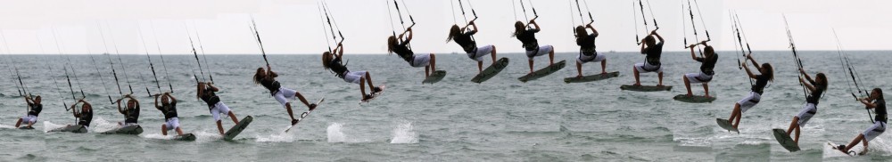 - Pic 2. As for a normal jump Karine has sent her kite back relatively hard, you can see how her bar is very positively steering the kite against the direction of travel. She has also dropped her weight to counter the upward pull of the kite as it rises.