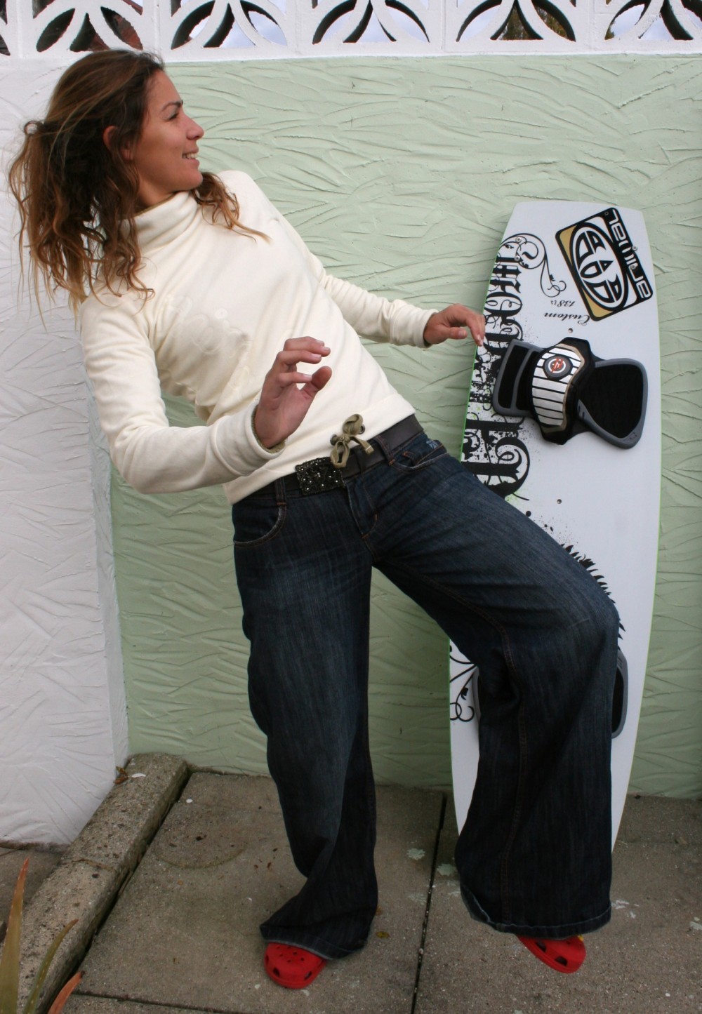- Pic 6. Just off the water you can see how Karine’s shoulders and hips are still turning due to the pivot nature of her take off. She’s pulling her front leg up which in turn will pull the nose of the board through the wind.