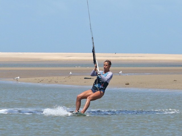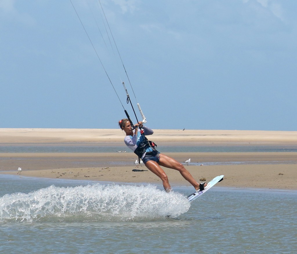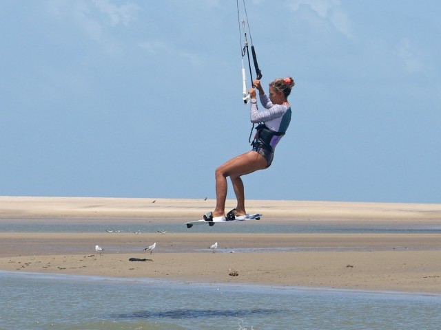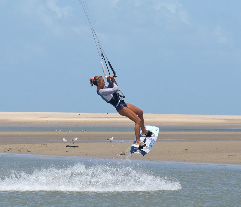 The key to any intentional small jump is a short, sharp send. You still need to move the kite so that it generates lift, but you don’t want to send it too far. Theoretically, you’re trying to get it to around 12 or a fraction behind. If you move it too slowly, you won’t get any lift, and it’ll be hard to hold your edge. You can see that Karine has steered her bar back to move the kite up, but it won’t be for long…