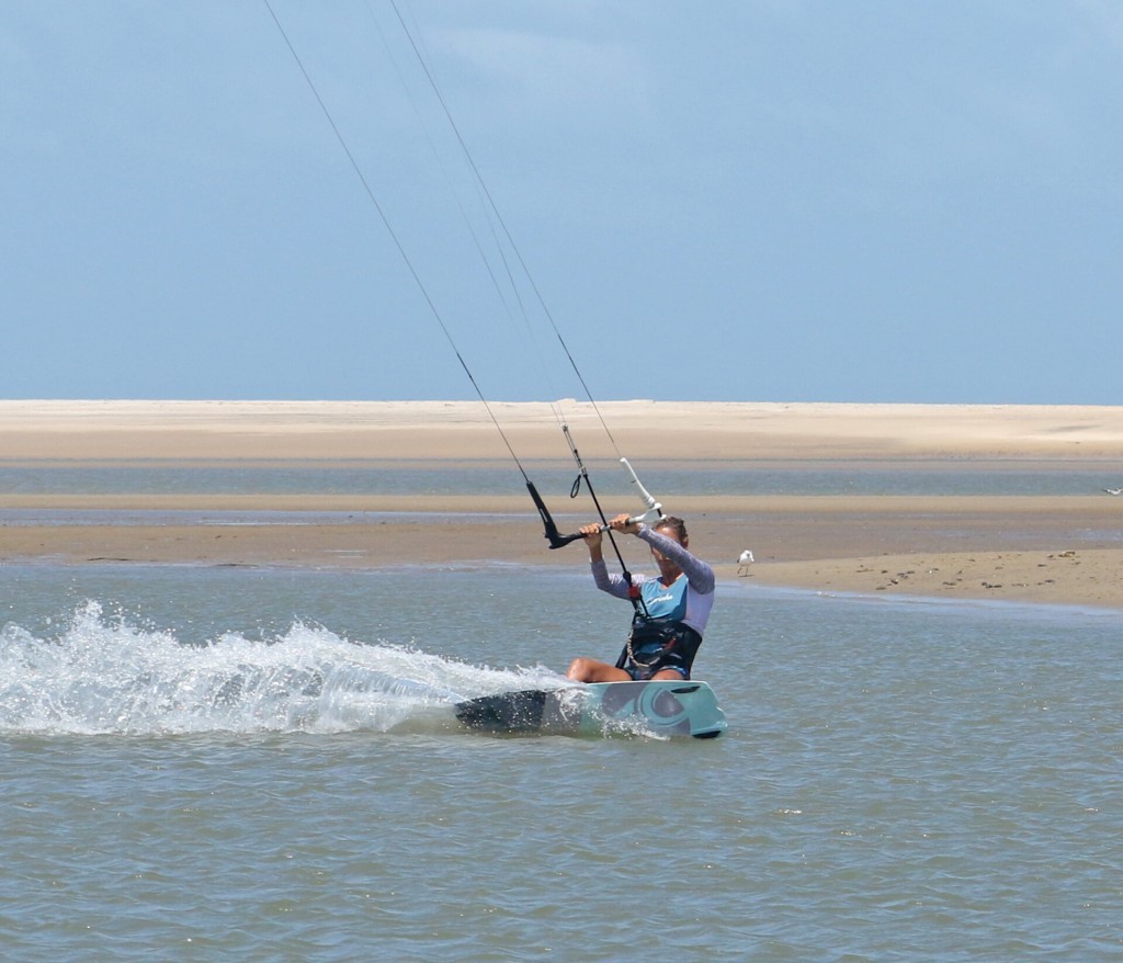 Like a jump, drop your legs to get the board underneath you so you can land over it. At first, just getting around, even if it means landing on your bum and water-starting out, is perfect. Once you have the movement and feel comfortable rotating, you’ll start to know where you are and can then work on diving the kite with a bit more oomph and landing dry, even if it’s across the wind.
