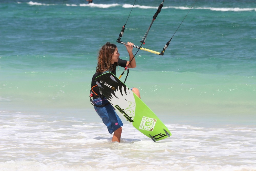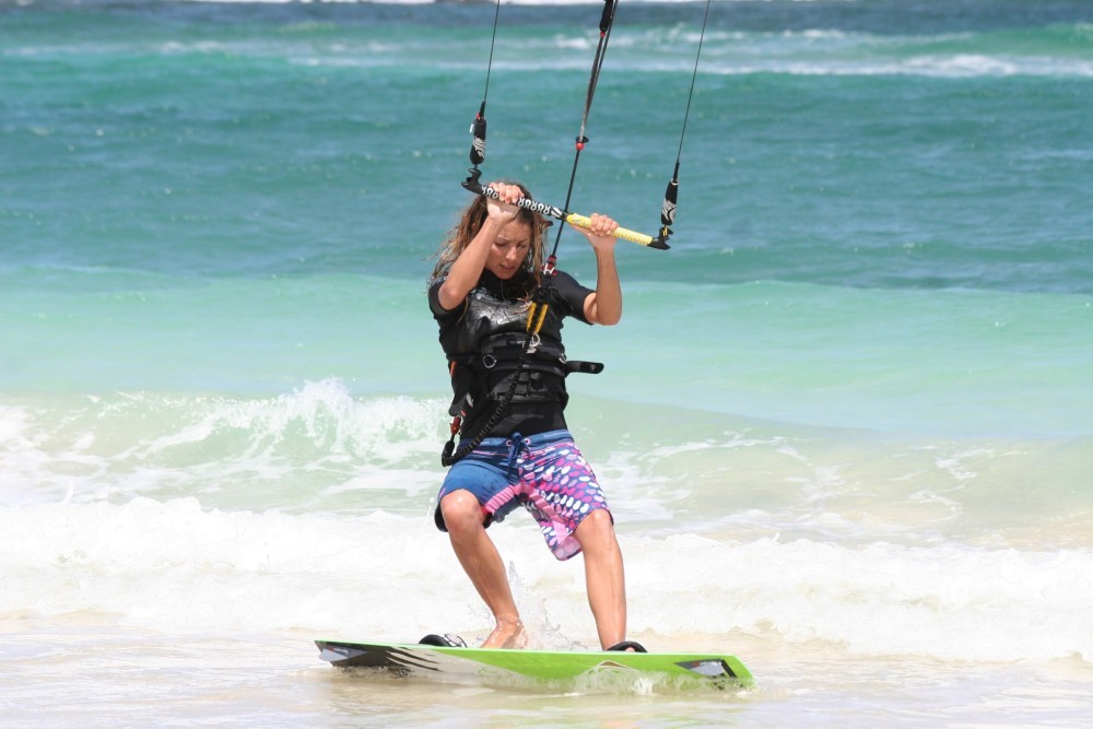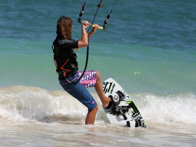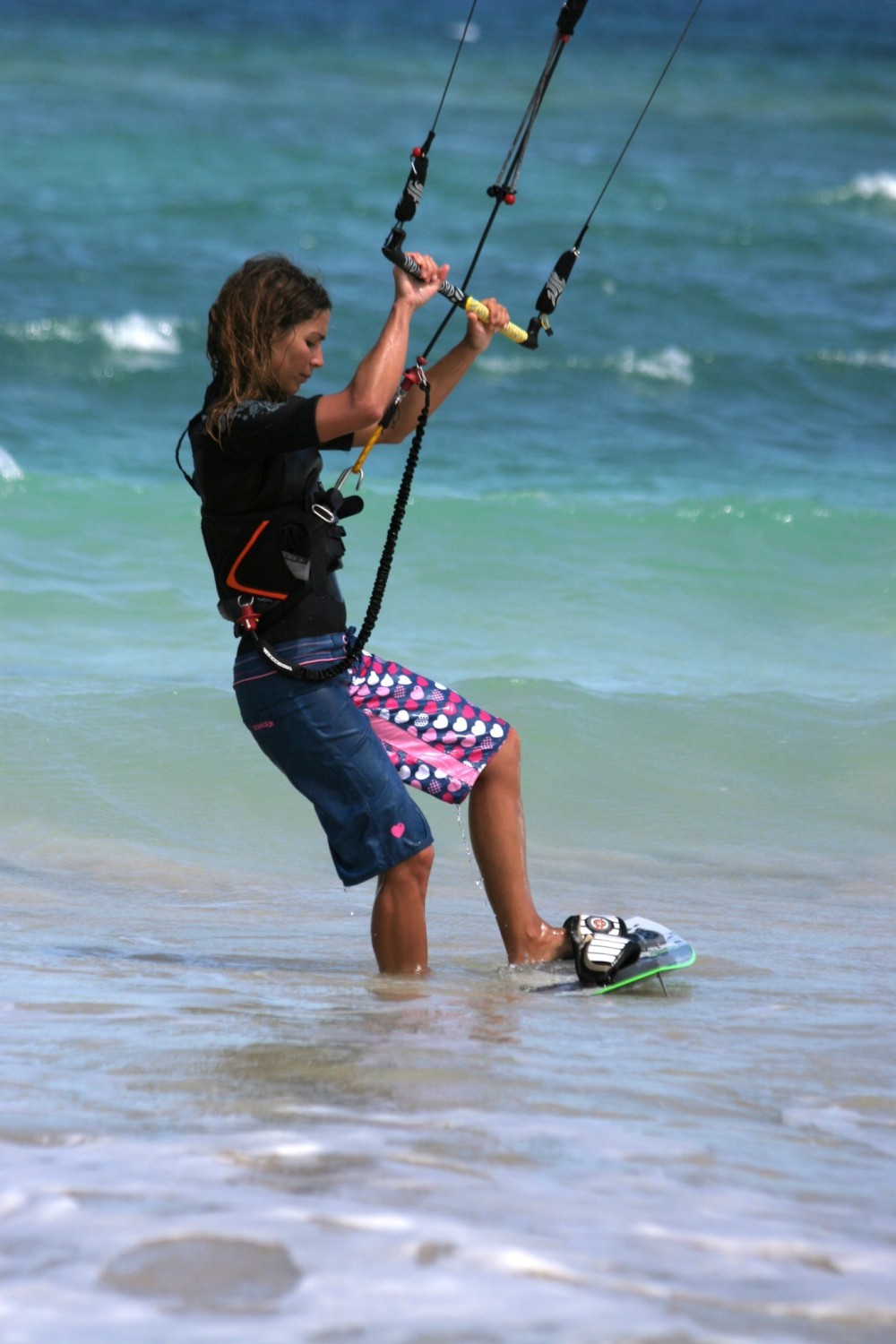 - Pic 5. The kite now picks Karine up, so she lifts her back leg out of the water, her weight committed to the harness. With her toes lifted the nose of the board can slide further off the wind.