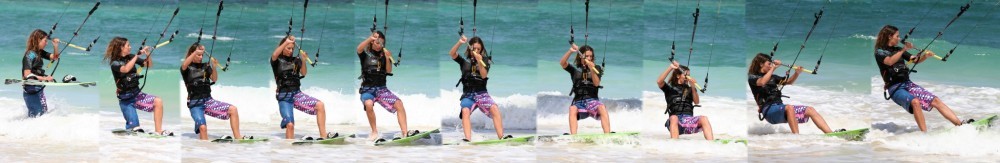 Pic 9. From here she can start to push her feet away from her, looking where she wants to go and extend her front leg slightly in order for her board to carve around upwind and away from the kite. - Pic 10. Now on her edge Karine can start to push her hips up, twist around and adopt her riding stance. Job done!