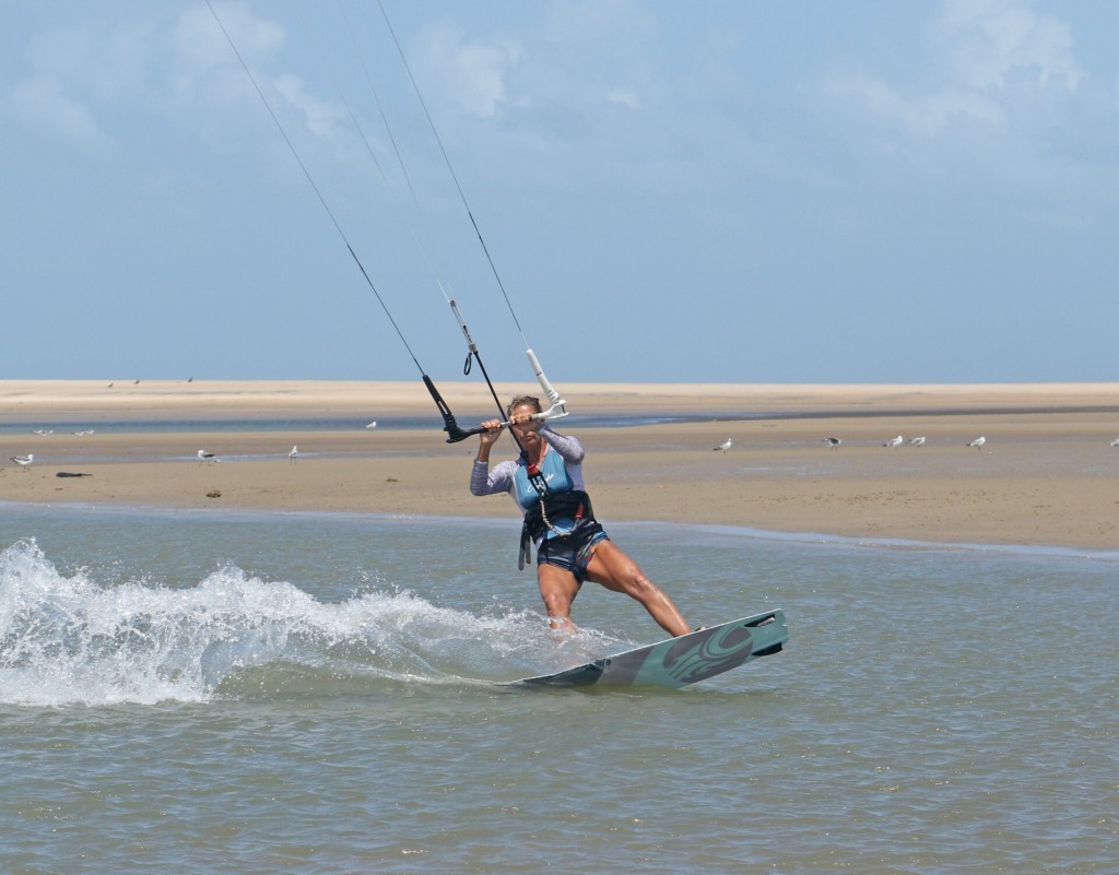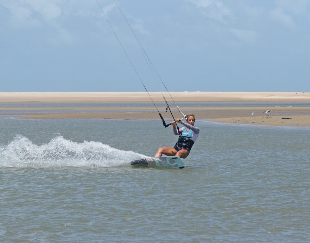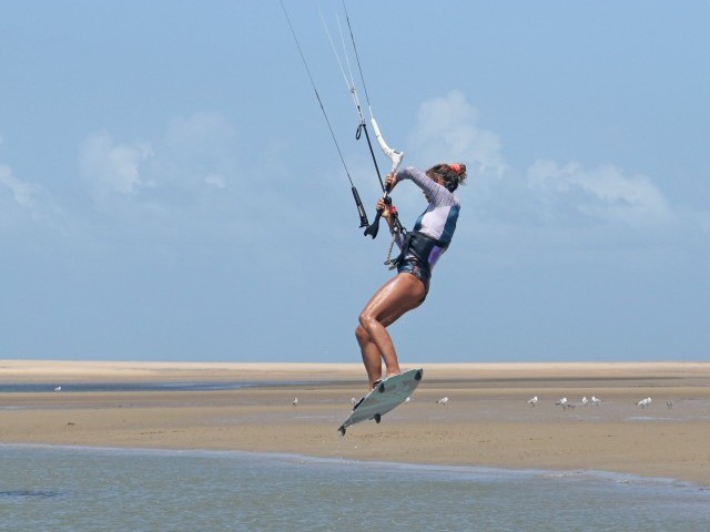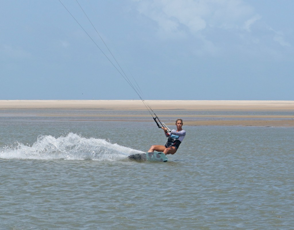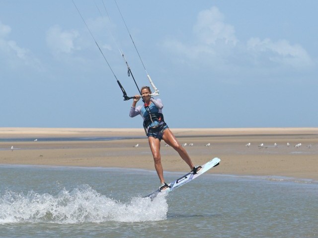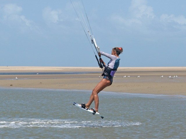 The final piece of the jigsaw puzzle, landing with the board pointing slightly off the wind. If you do this, you’ll keep moving even if the kite isn’t quite right. If you don’t, you’ll land on an edge, which will put the brakes on and stop you dead in your tracks. Drop your legs underneath you and twist your hips, pushing your front foot downwind. This way, you can land tail first, over the board and follow the pull of the kite. Once you do, you can then carve back up onto your edge, pull the kite up from its dive and ride off into the sunset with a big smirk on your boat race:) Karine has given her bar a hefty dive, and she’s still looking downwind. She’s dropped her legs and is twisting the board off the wind: the result was a smooth and flowing touchdown.