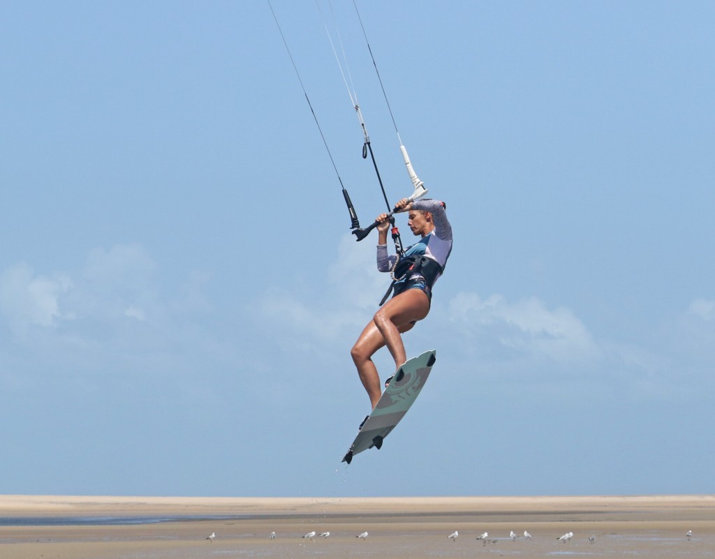 Once you’re on the way up, you can pull the bar in, making sure to keep it level. This way, it will encourage the kite to stay above you. The most crucial point here is to keep looking forward, as if you were jumping. This means resisting every cell in your body, which will be crying out for you to turn and look the other way, how you intend to land. Ignore the noise, just level and look. You won’t have stopped moving that way anyway, so it’ll also help you keep balanced. Bring your knees up and enjoy the moment. You can see that Karine has her bar level, and she is still very much looking forward.