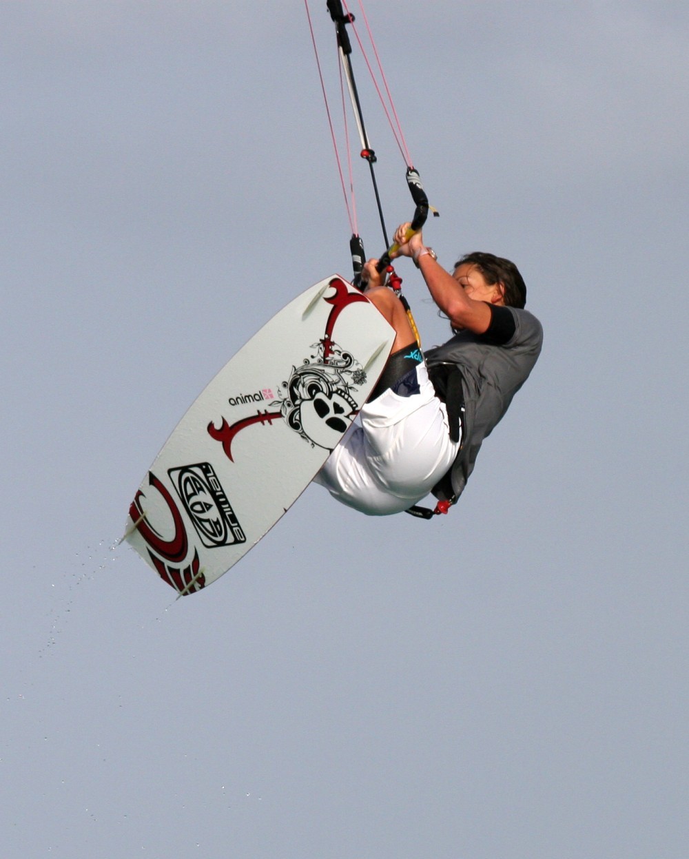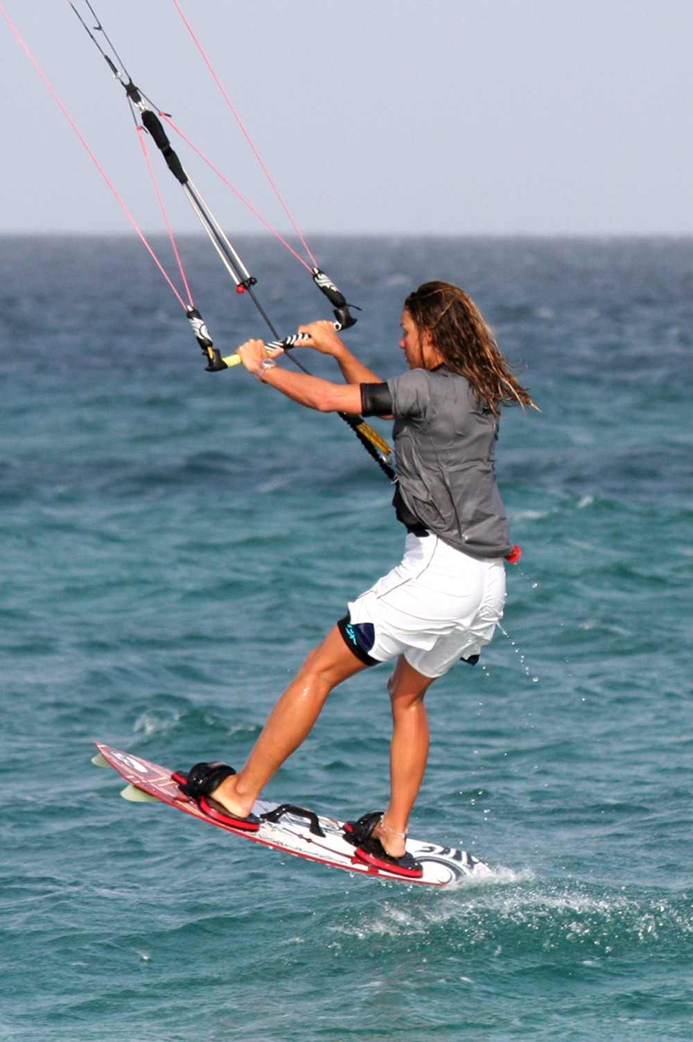 - Pic 5. With the kite now moving back above and behind her, Karine is ripped off the water.