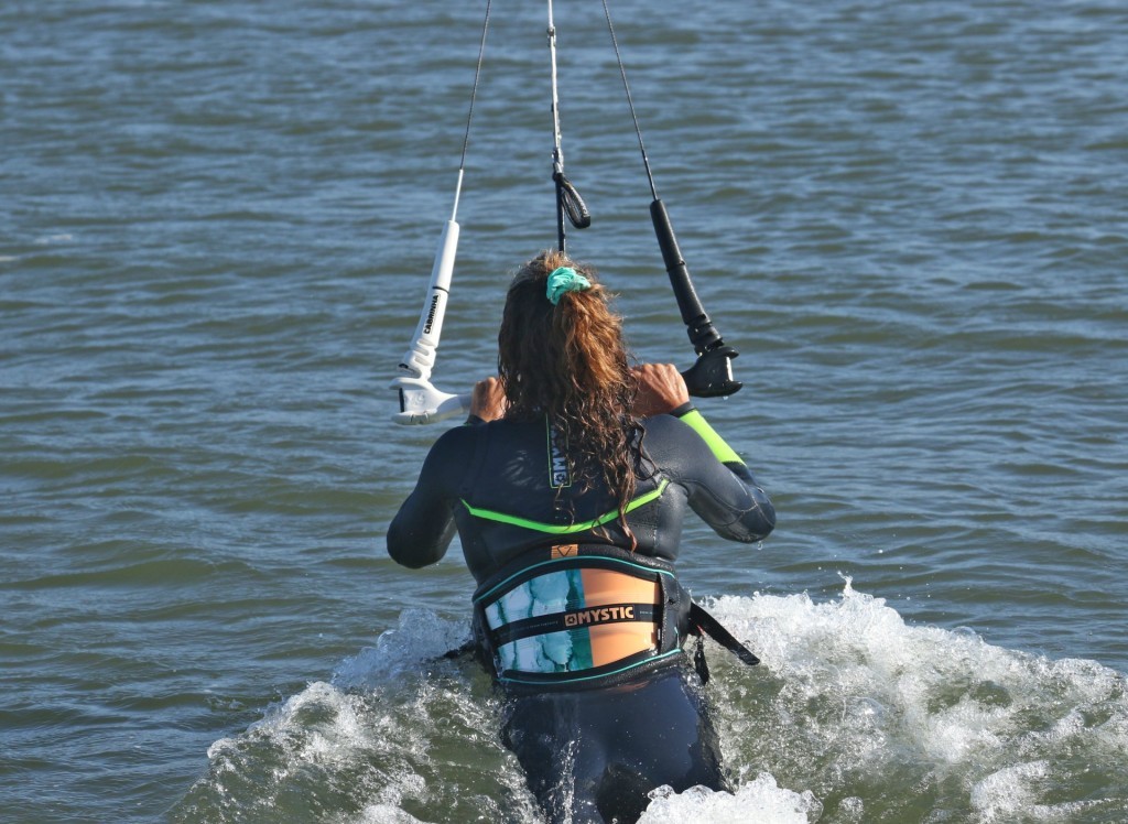 You need to watch your kite so that you know where it is. This visual comes with its own problems. As soon as you see your kite turn down, there'll be a million synapses screaming for you to stop. Then as the pull comes, they are joined by an even stronger impulse to let the bar out. Once you've pulled the proverbial trigger, you need to keep the push-pull on and the bar on the sweet spot. Commit! Sounds simple enough, but you'll have to make a concerted effort the first few times. As the kite pulls, let yourself go with it. Depending on how aggressively you steer the kite, it will pull you downwind, first slightly to the side you turned it, and then slightly towards the side it's climbing back up. When done correctly, it'll be a short but sharp pull, a quick turbo kicking in before subsiding. Try to keep yourself balanced and flat on your chest and hips as the kite drags you through the water.