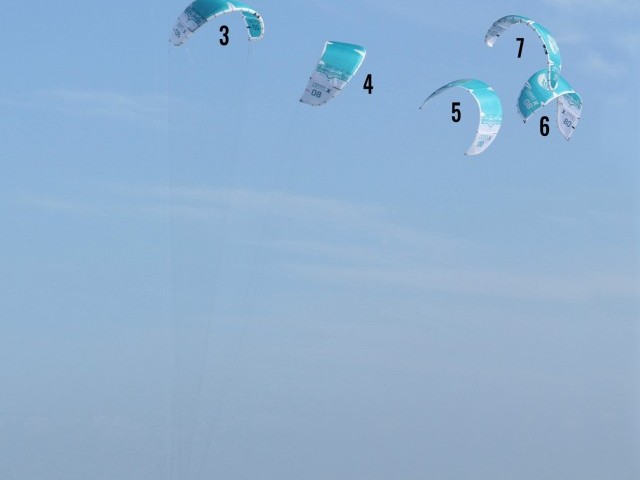 - In position 1, Karine has just started her descent. She's looking forward, and the kite is above her.