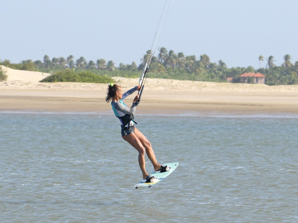 This time round, you’re going for a little more height. Nothing extreme, but in order not to be rushed, you want more time to get your bearings and prepare. Check that the coast is clear! You can approach with a little bit more speed, comfortably powered and on a good edge. It’s still a jump transition, so treat it as one. You’ll give the kite a short, sharp send, but this time, it doesn’t matter if the kite goes past 12 o’clock as you’ll have time to reposition it! You can see that Karine has a solid edge and is aggressively resisting as she sends the kite up.
