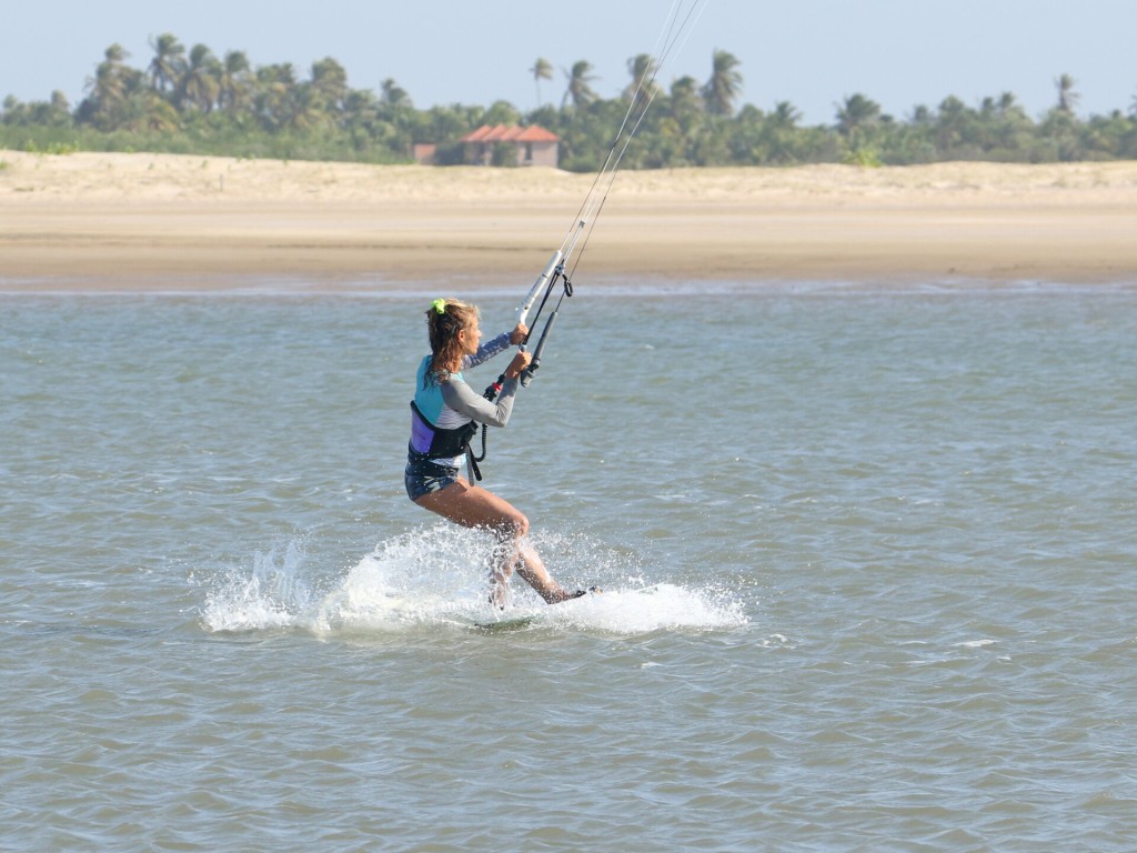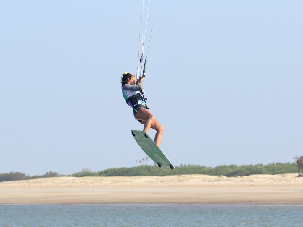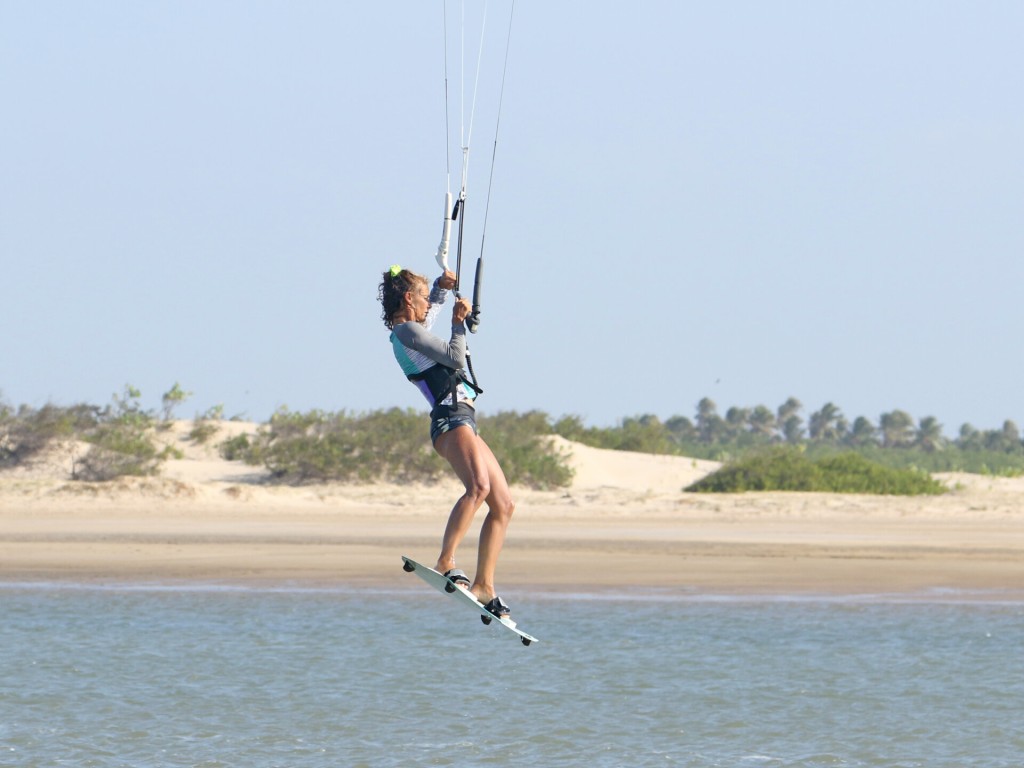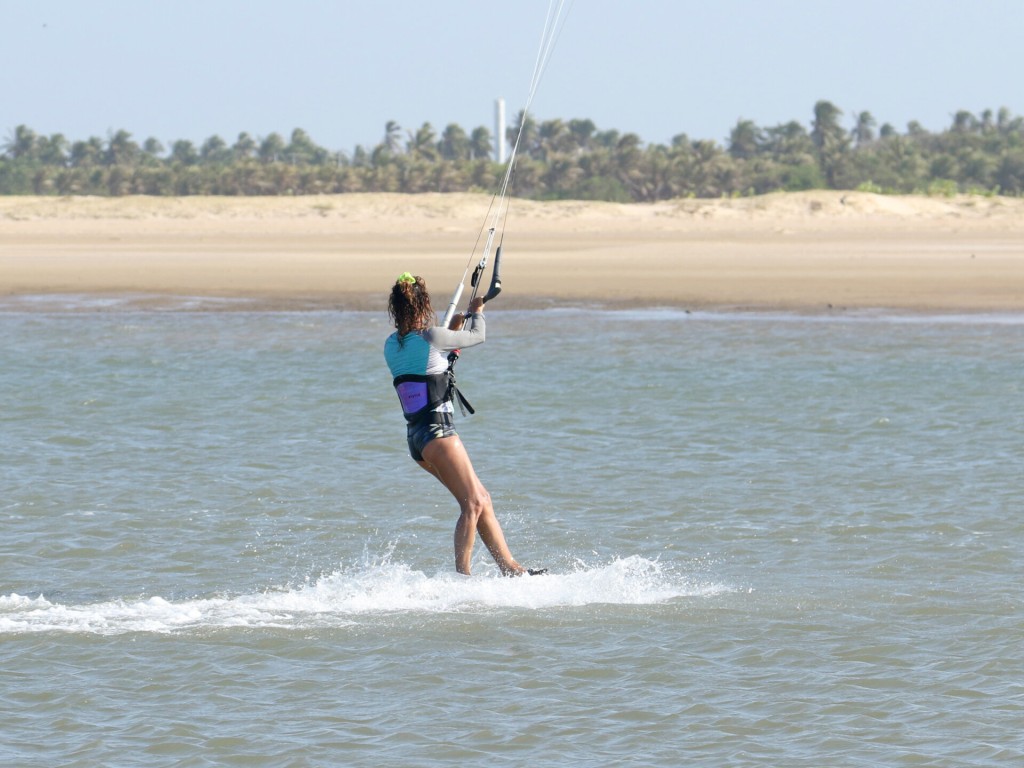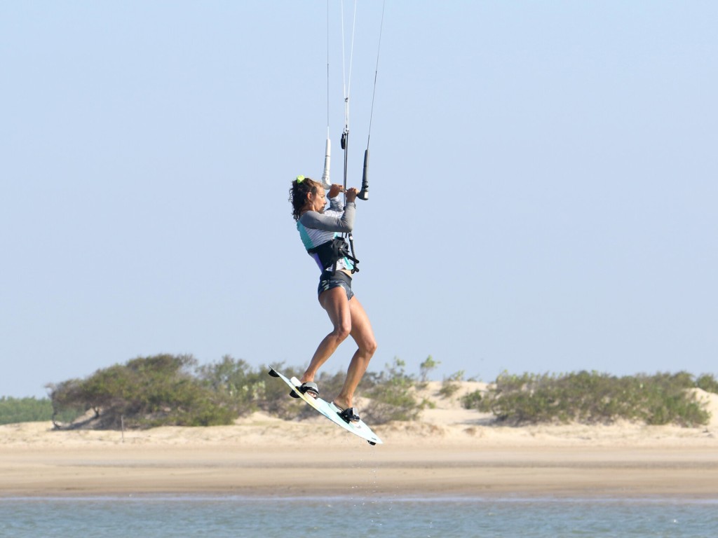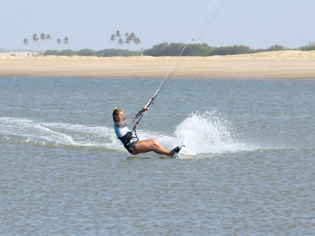 You can encourage the kite up and around by letting your bar out a little and allowing the kite to breathe. Keep carving to keep tension on the lines and follow the kite around. Once it’s flying back the other way, level the bar to stop it looping, and you can then steer it in a new direction. In the photo Karine is still gently carving back onto her heels, she has tension on her lines and has guided the kite in the new direction. All the while with some stylish and practical pull from the kite. Job done.
