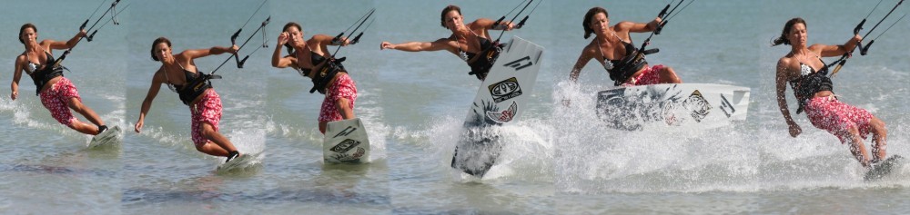 - Pic 6. With the board rotated fully around Karine lands with speed back on her heelside edge, with her weight still committed upwind and the bar still in position to keep power in the kite. Wonderful.