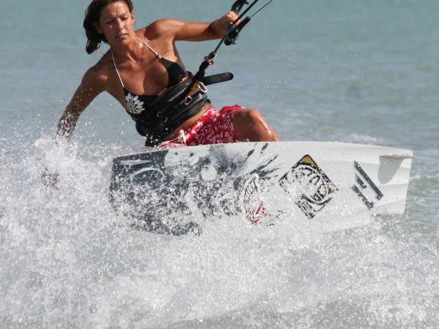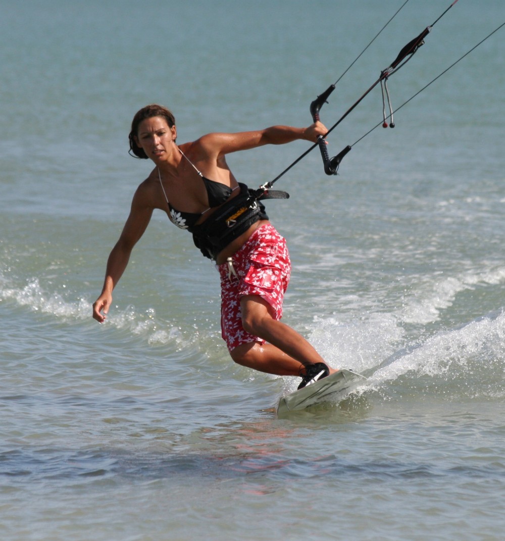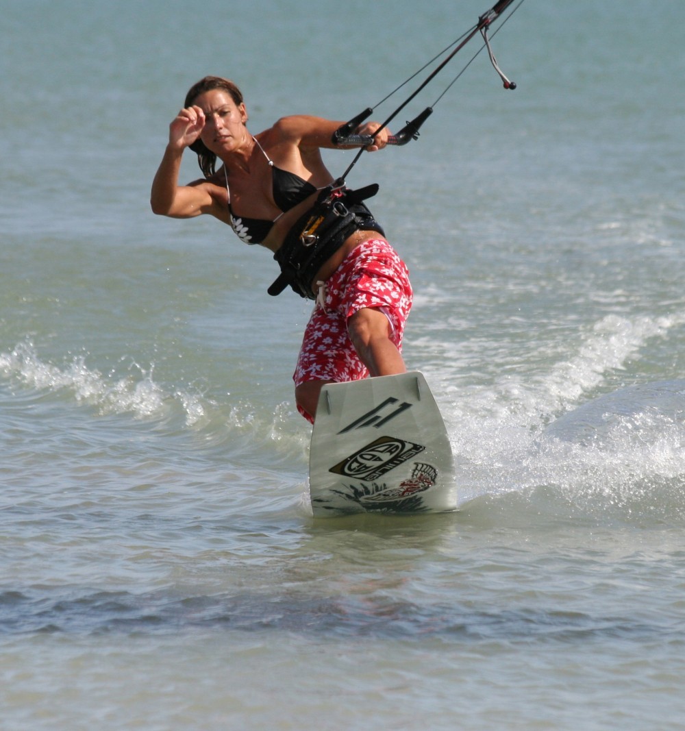 - Pic 2. In preparation to spring up Karine has bent her legs. As a result you can see that her board has flattened off, so if she hangs around too long she’ll lose her speed, as she turns more off the wind and towards the kite.