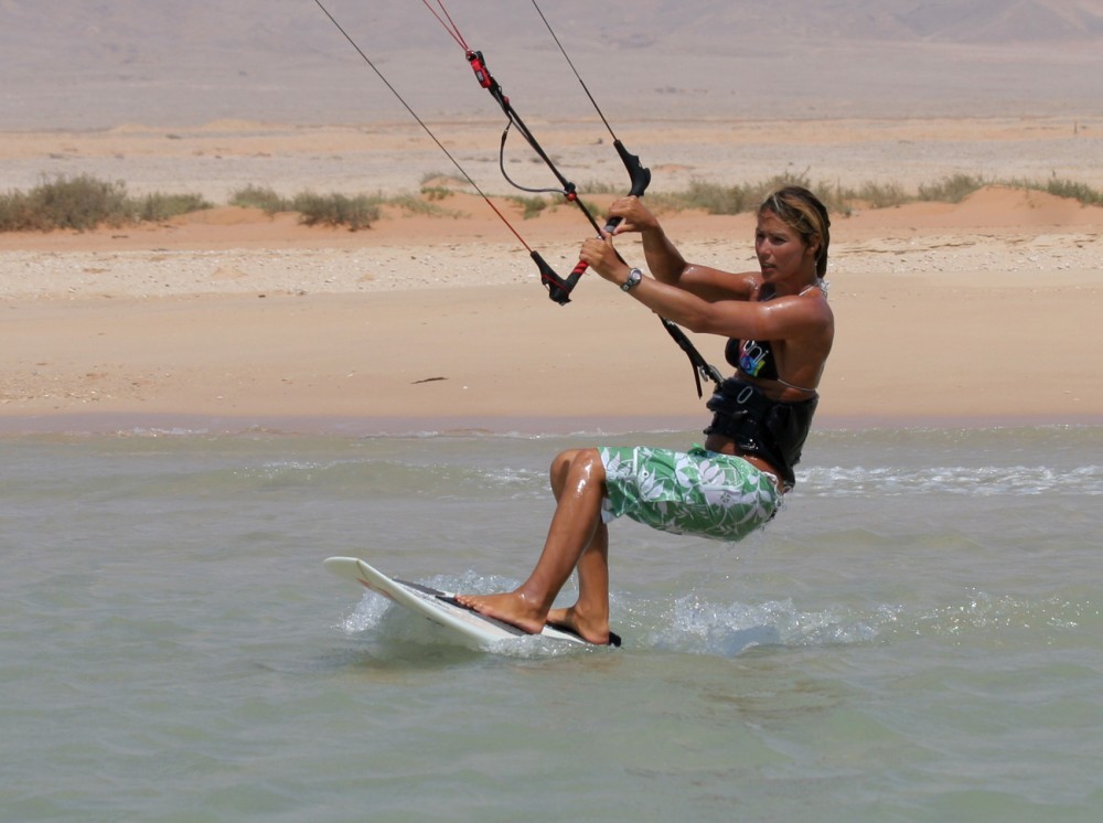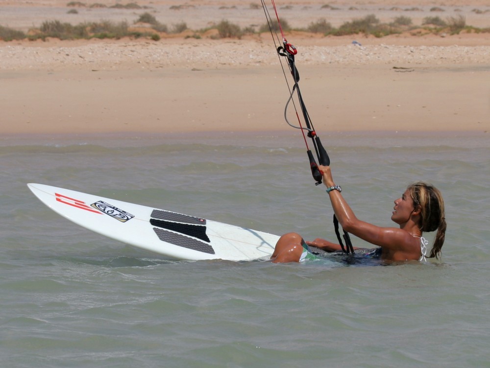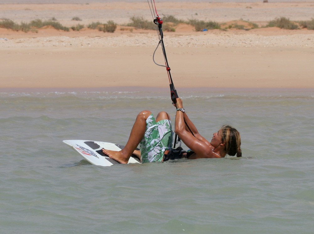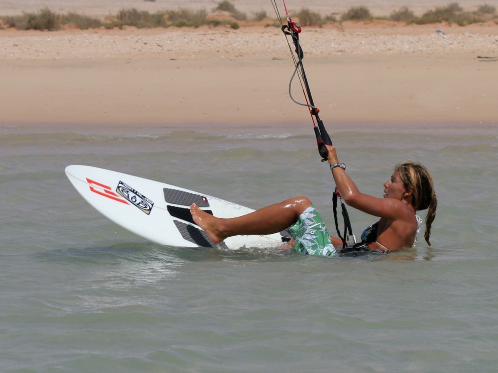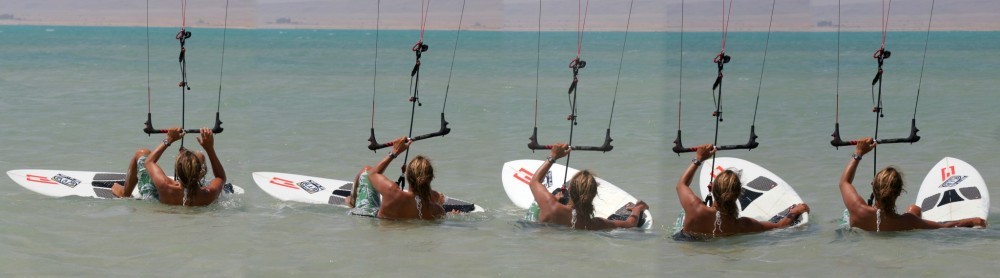 - Pic 5. Karine reaches up for the bar and pulls it in to get tension in her back lines. With her knees bent right up and her body between them, any pull in the kite keeps the board against her feet.
