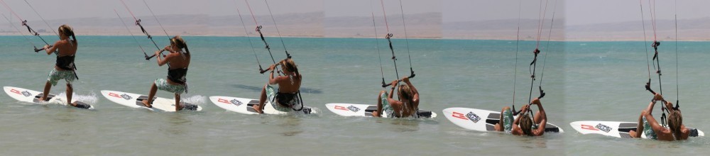 - Pic 1. Sitting back in the water with her kite at 12 o’clock and as little power in the kite as possible, Karine grabs the back of the board on the far side edge (rail) with her back hand, far enough to give herself enough space to…