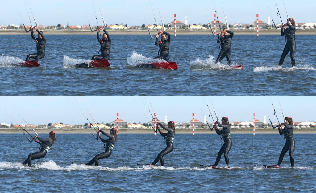 As long as you can keep your edge, you can keep the kite moving. Your aim is to get it past 12 o'clock so that it's "pointing" back the other way. This has two advantages. Firstly, once the kite moves into the other side of the window, it will act as a brake, think parachute behind a drag racer (with perhaps a touch less speed). Secondly, once it stops you, it's your cue to go back the other way. Now, this is where you are tearing up the rule book. If you were slide turning, you'd be thinking about moving your weight forward and sliding the back of the board. However, you need to override your muscle memory and keep tension in the lines and tension through your board and focus on edging forwards. You can see in the pic that as the kite moves further up, Karine is still driving against her edge.