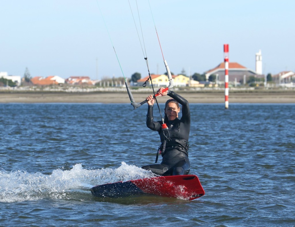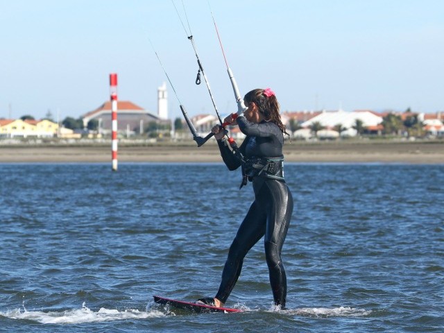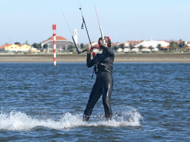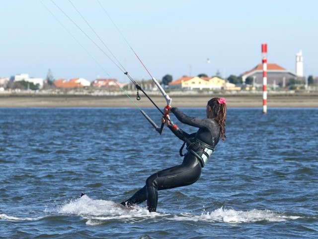 As the kite rises, it will generate lift. You, however, need to keep resisting. The temptation is to sit low, but if you do, there's a possibility that you'll compromise your edge. To counter the lift from the kite, you can ease the bar out a tad more. This isn't a must though and will depend on whether the lift is too much for you to control. You're aiming to get the kite past 12 o'clock but in the most controlled of manners. Keep looking where you're going, and be aware that effort is required to edge. Looking at the pic, you can see that Karine has eased her bar out. She's still drifting the kite slowly but is very much edging forward.