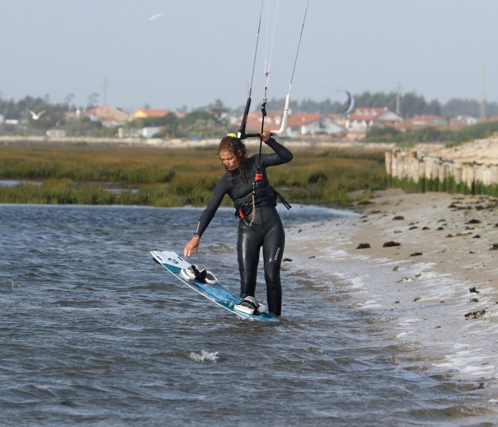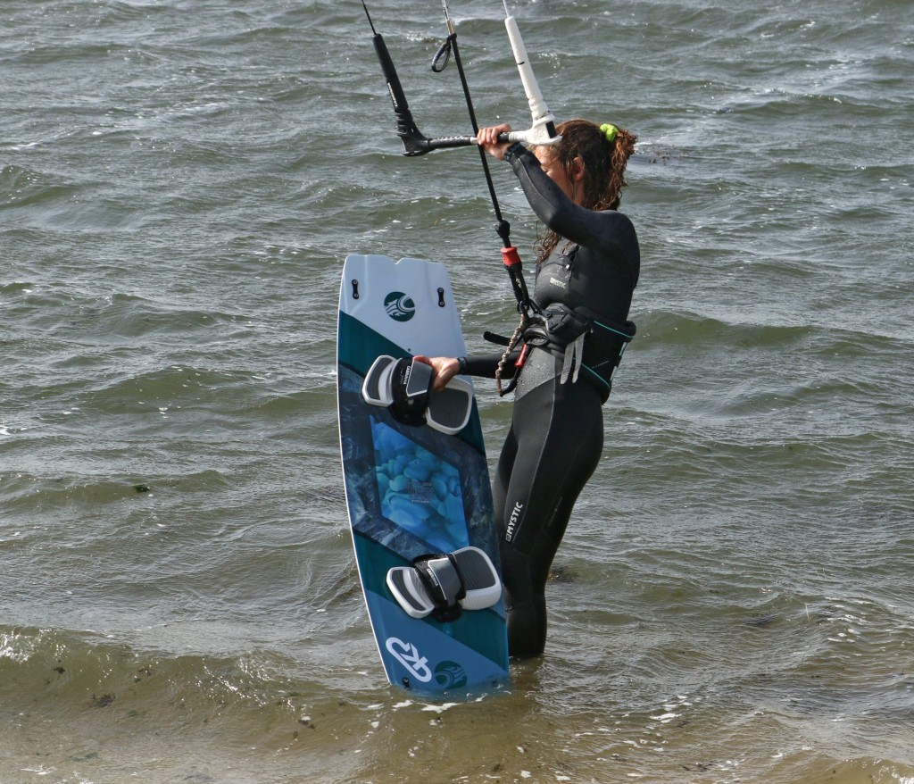 Best way to walk in is likely the way you normally would, front hand holding the board, whilst your rear hand controls the kite and flies it away from the beach at around 1 or 11 o’clock. The easiest way to hold the board is by the front foot strap. This will make it easier to place the board where you want it. Once you’re in a few centimetres of water, you can drag the board in front of you as you crab out. Karine has her rear hand centred on the bar. Her sweet spot is relatively far out, as she will need power, lift and support from the kite. She’s holding her board by the front foot strap, and she’s walking out to calf-deep water. You can happily wait in this position if you need to let someone pass or some white-water wash through.