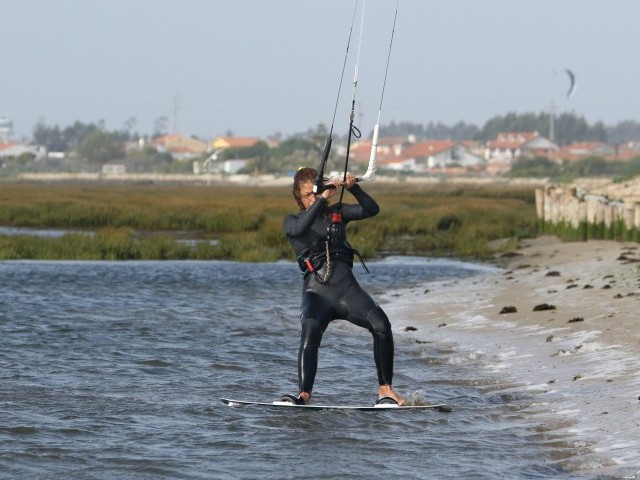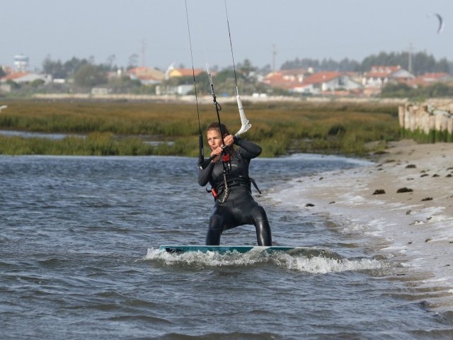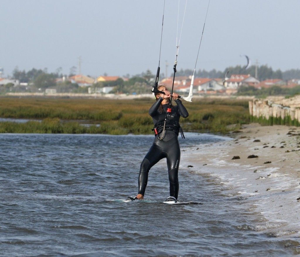 With your front foot in, you’re ready to rock. It’s fair to say that the wind affects this next bit considerably. Standing on one leg with a bit of help from your kite is relatively simple in constant wind. However, if the wind is gusty, you will find that the odd little hop to keep balance is needed. It shouldn’t look like you’re changing out of your wetsuit in the shallows, but you’ll unlikely have the poise of Nureyev. With both hands narrow on the bar, you want to move the kite slowly back to either 1 or 11 o’clock, whichever is away from the direction you intend to go. Keep the bar pulled slightly in to stop the kite bouncing about. And keep your toes up to keep your board in place. The reason to move your kite back is so that you can use it for lift to help you get on the board without sinking it. If you start at 12 o’clock you can only dive the kite down into the window, which is likely to end in tears. Looking at Karine, she’s pulled the bar in a touch as she moves the kite back to 11 o’clock. Her hands are narrow on the bar. She’s watching the kite, and even though the nose of her board is submerged, she keeps her toes and forefoot up so that it can’t go anywhere.