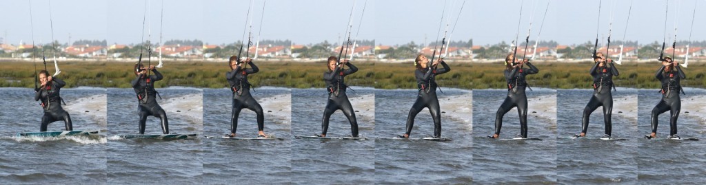 Once your back foot is in, it’s full steam ahead. Drop your weight onto your heels and twist to look upwind. This will push your hips back and set you into your riding position. As you do this, you can dive the kite. You’ll be in a good position to take the power as it comes on. You can see that Karine has dived the kite, dropped her weight upwind and back, directing the board where she wants to go. Bingo.