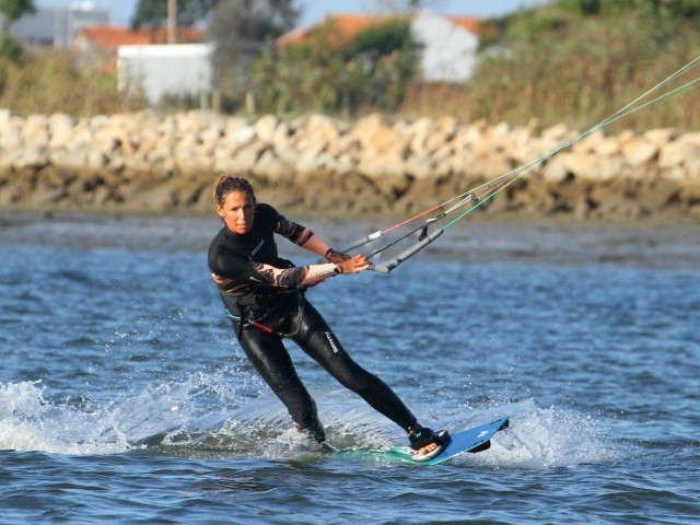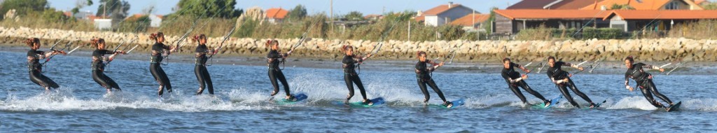 Now that the kite is on its merry way you can keep it turning and focus on your carve. As we said at first we’re happy to pivot a bit more off the back foot. As long as your weight is back and the board is carving the kite will then pull you through the turn:) To get your carve on, flex your ankles, pushing your back knee across the board and look back to where you would like to go. In the picture Karine has her back knee pushed across the board, her weight is still back over the tail, her hands are still push/pulling the bar as much as possible, she’s on the sweet spot and she’s now looking back the other way. In this position you are set to complete your carve as soon as the kite starts to pull. In this image Karine’s kite is turning down, it hasn’t yet started to move though the window, but it’s only a matter of milli seconds!