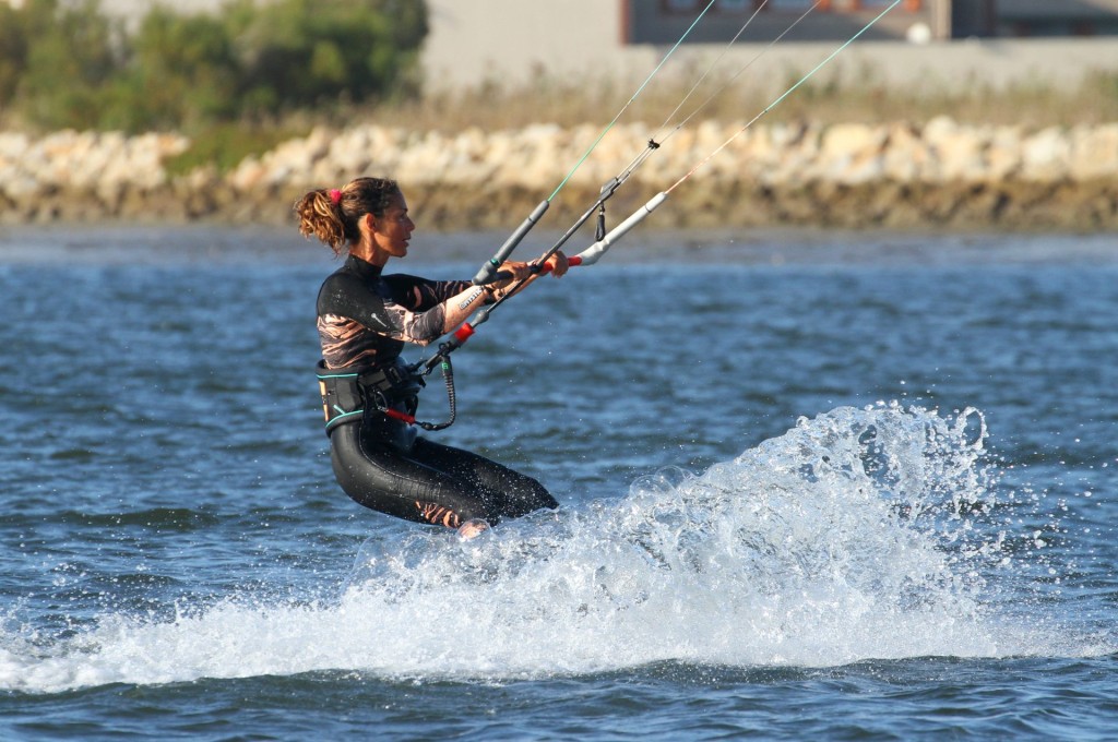 This is the moment you’ve been waiting for. As the kite starts to fly across the window, even momentarily in a little loop it will start to pull. What’s beautiful is that the pull starts one side and moves across the window, actually helping you around your turn as it moves across. However as there will be some power you must direct that energy down into the board to drive yourself further around and resist the temptation to follow the kite and therefore lose tension, power and speed. It’s also possible that the kite will start to climb again, and if this is the case you need to stop push/pulling, level the bar and steer the kite so that it flies forwards in the new intended direction. Karine has dropped her weight more against the power in the kite, she’s levelled her bar and is focusing on finishing her turn so that she ends up toe side going back from whence she came. If you feel overpowered during the carve you can ease the bar out a bit.