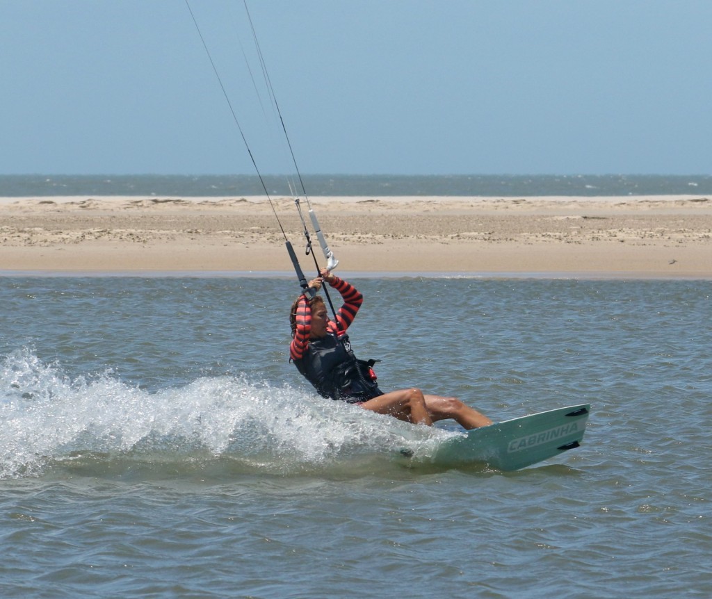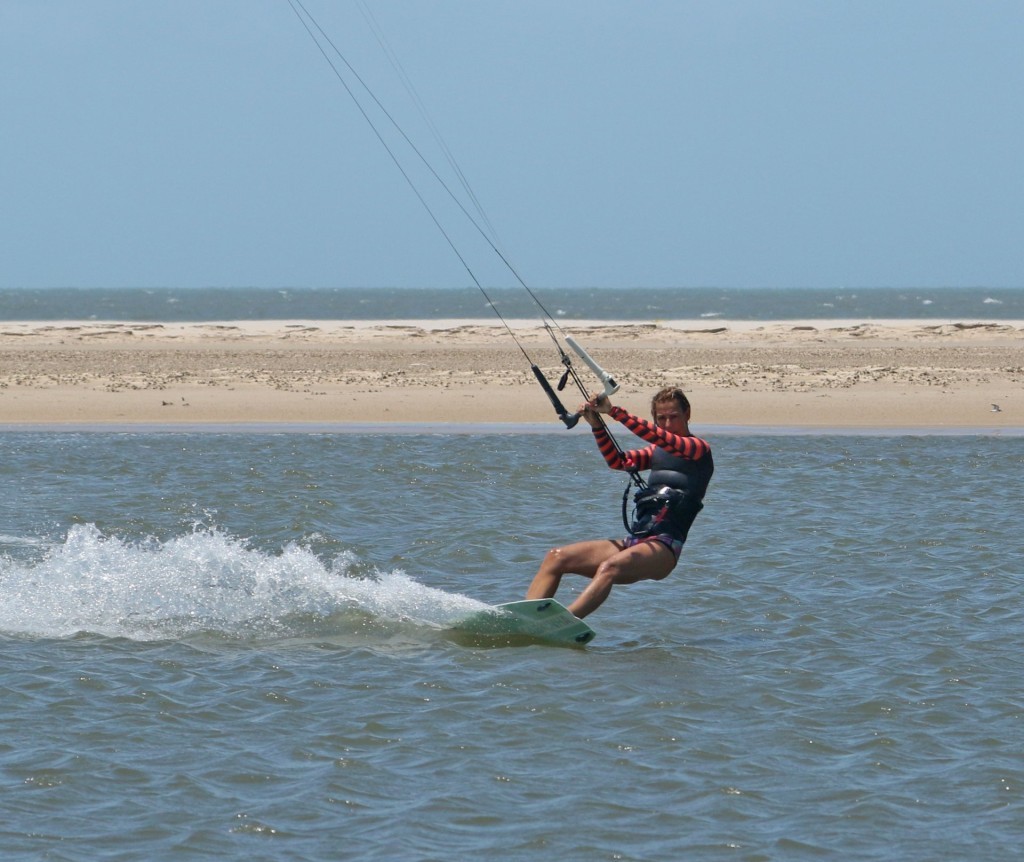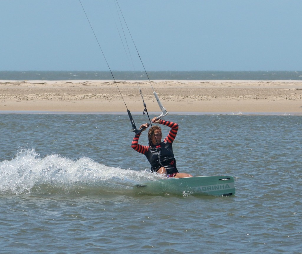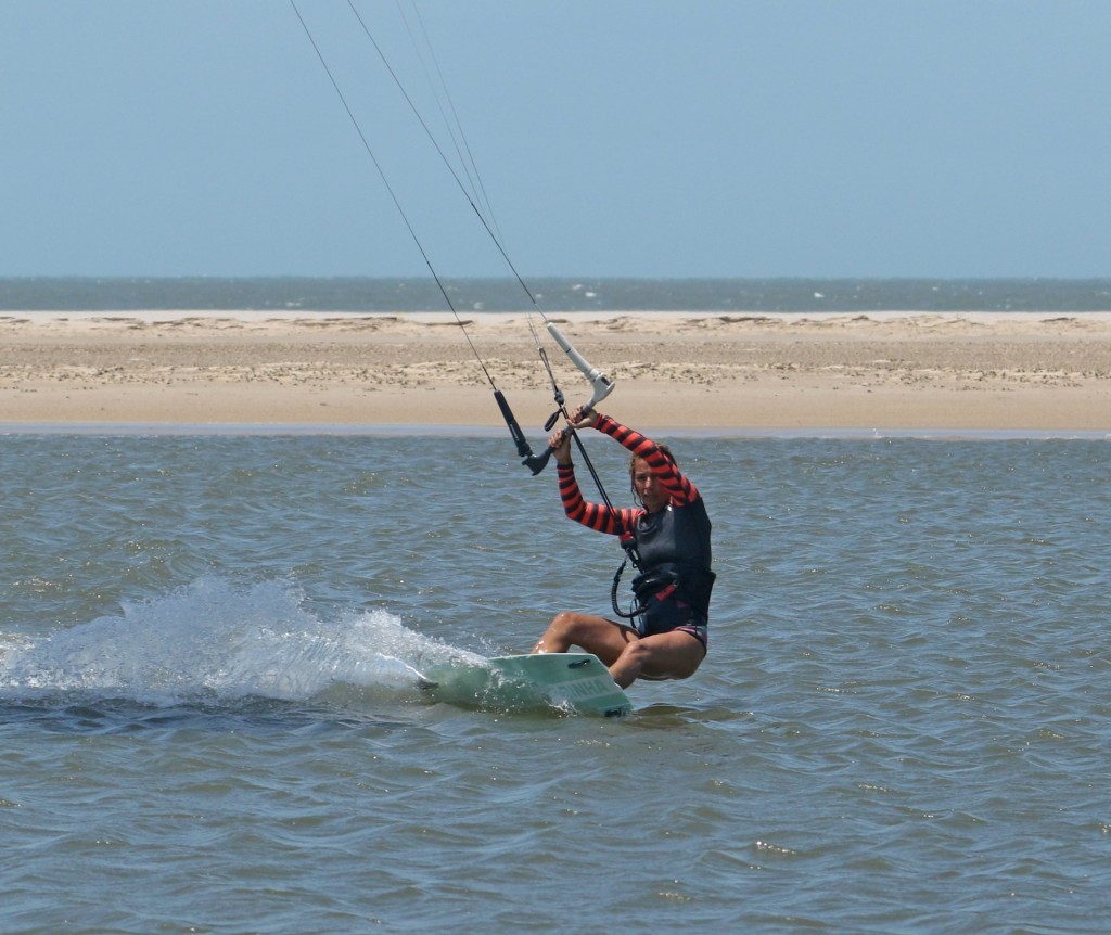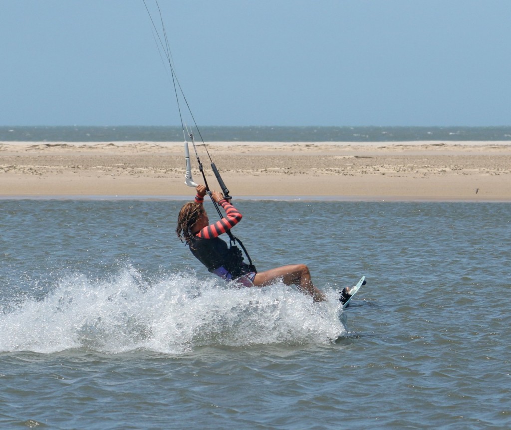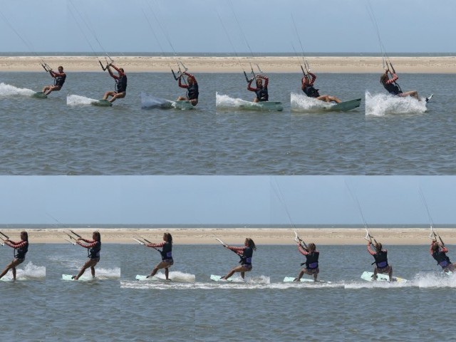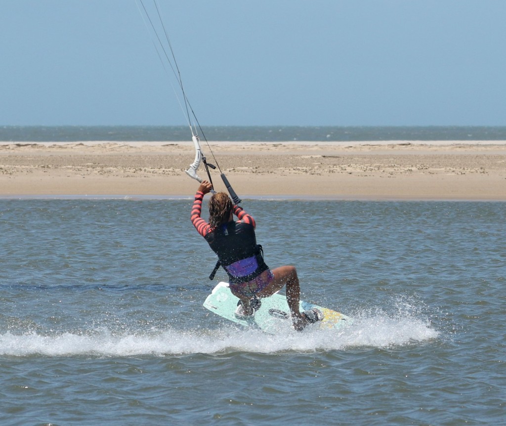 You need to get the board facing back from where you came. This may sound like fool’s gold, but it is possible. To keep the carve going, you need support and some pull. To achieve this alchemic combo, your kite must be pulled from the side of the window, the opposite side from which it started. As such, you must steer the kite further while supporting yourself and driving against your back foot. Look at Karine; she’s still carving; she’s feathered her bar out but is steering her kite back with her rear hand. This helps pull her further around whilst giving her support. You can see that there’s still a plume of water chasing her around. It’s a sure sign that she’s carving.