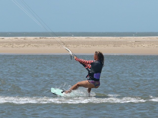 As the kite rises, you need to drop your weight low, sinking as much of your heel side edge into the water whilst hinging your hips to keep your upper body upright. Drive the board upwind, turning the board rather than twisting your body. Dropping your weight and carving upwind will increase tension on your lines. As such, you’ll need to let the bar out further so the kite doesn’t lift or pull, preventing you from carving further. Karine's hips are still parallel to the board’s centre line as she drops and carves. She’s still steering the kite up, but it has broken at the waist so that she can push the bar out.