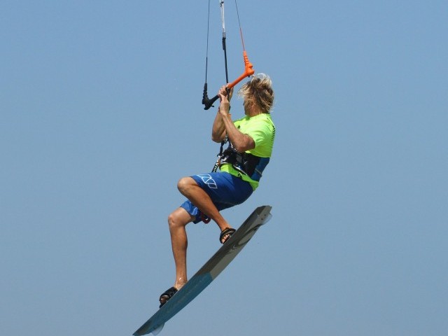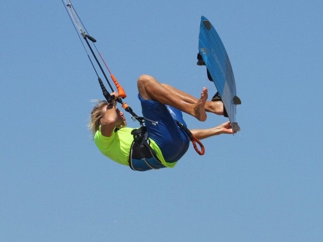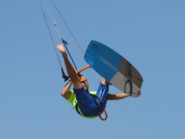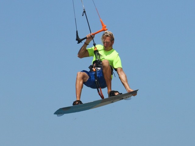 Once you’re off the water, you need to get prepped for the move ahead. Number one on your to-do list is stop the kite from moving any further back in the window, whilst number two is bring the board up nice and close so that you can grab it. Here Christian has levelled his bar by pulling a bit on his front hand, and he’s lifting his knees up towards him, focusing on bringing the back foot close. By doing this you’ll be balanced and confident, so the next step shouldn’t seem too daunting. Note how Christian is leaning back towards the kite with his legs swinging upwind. This comes from the good solid send.