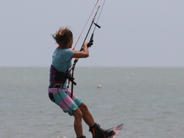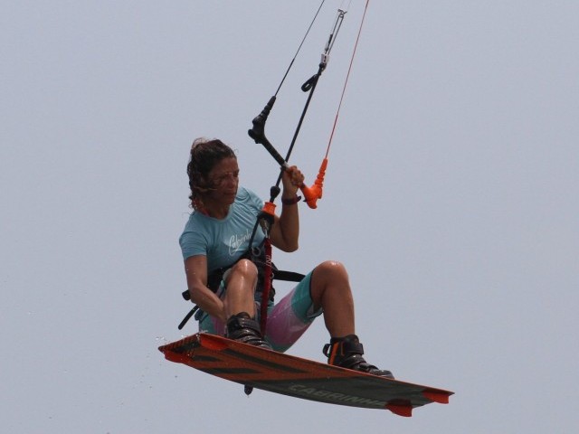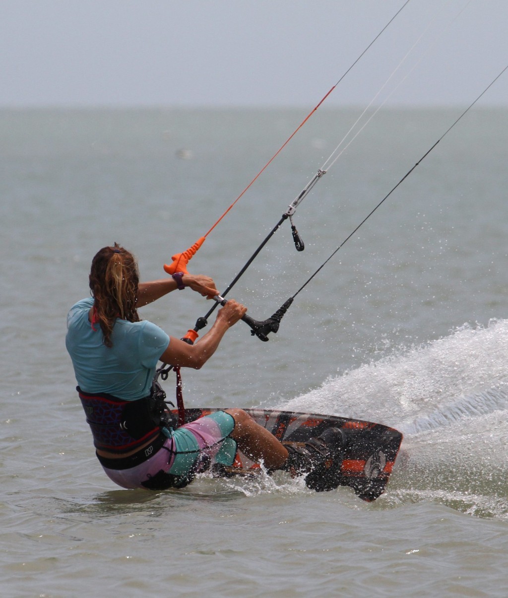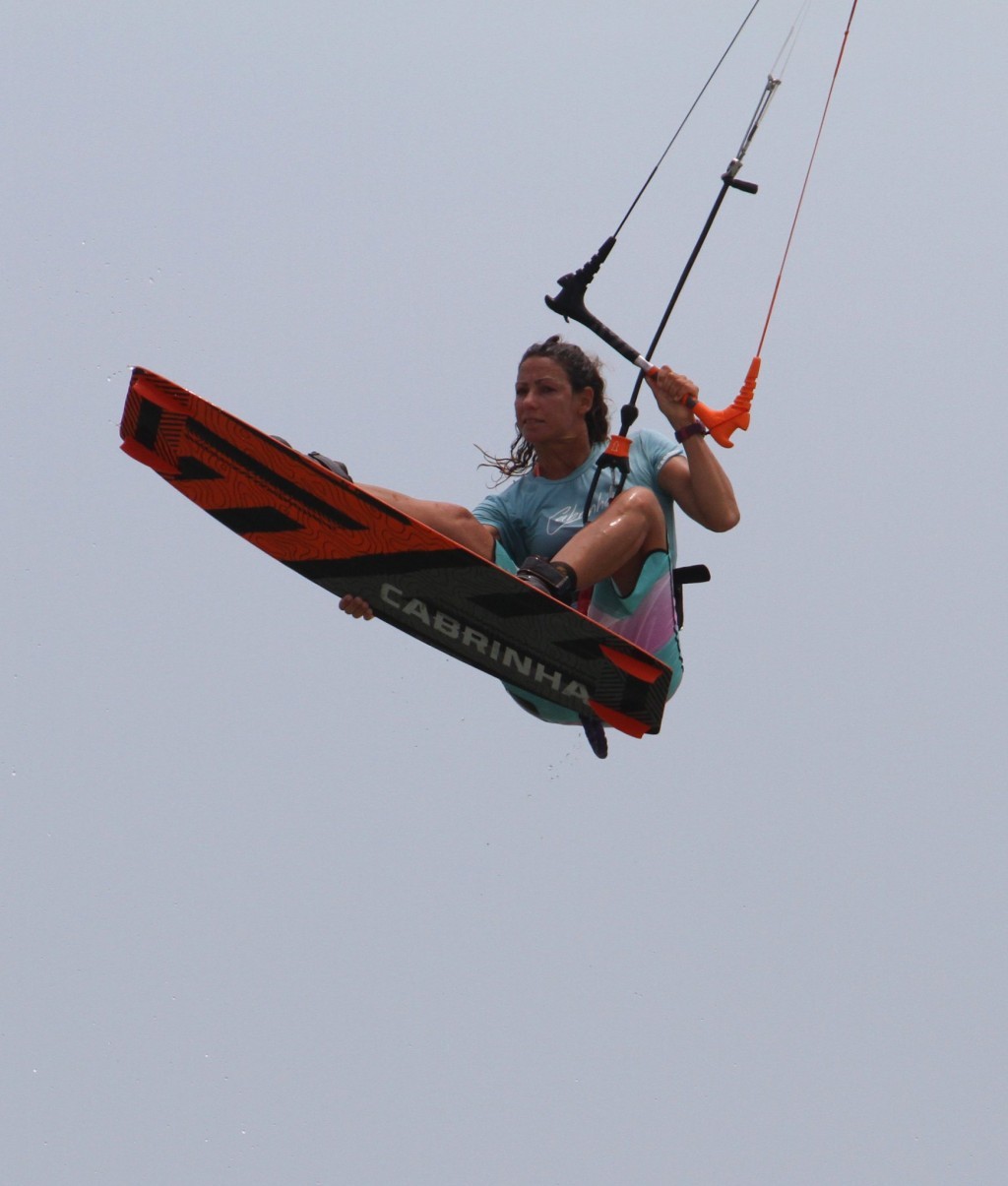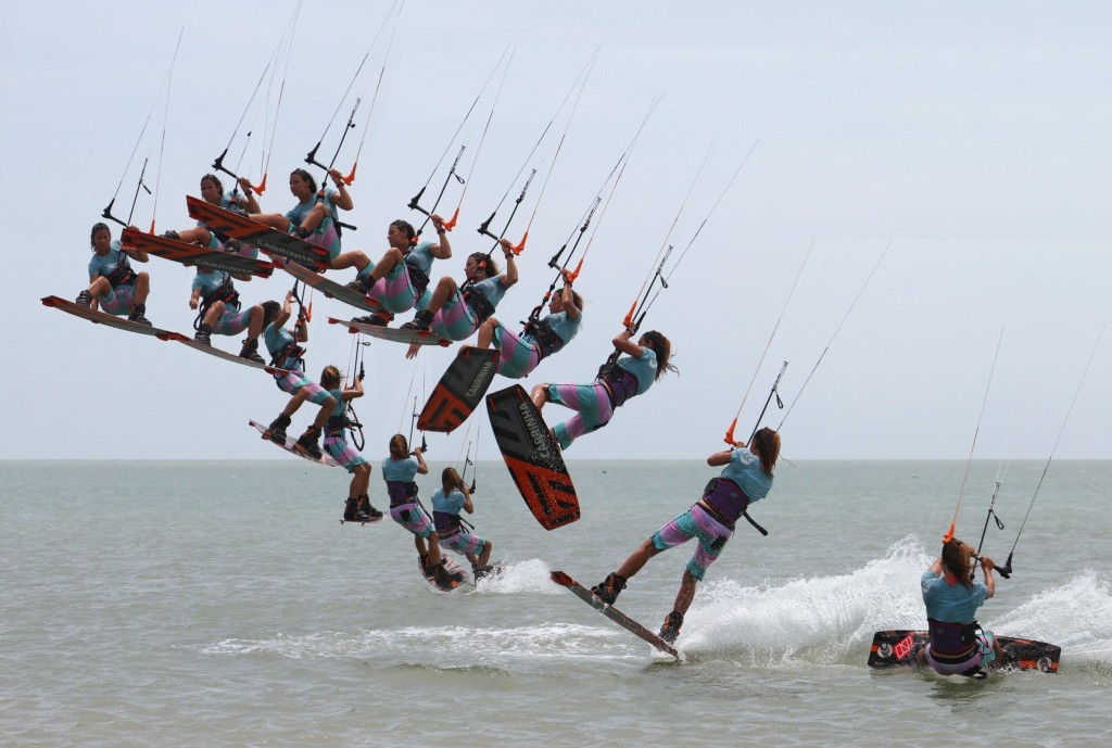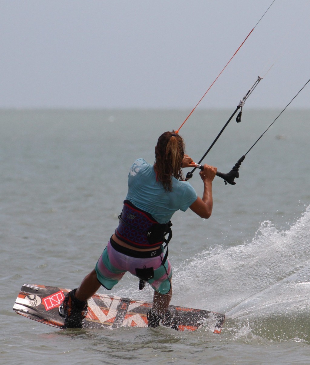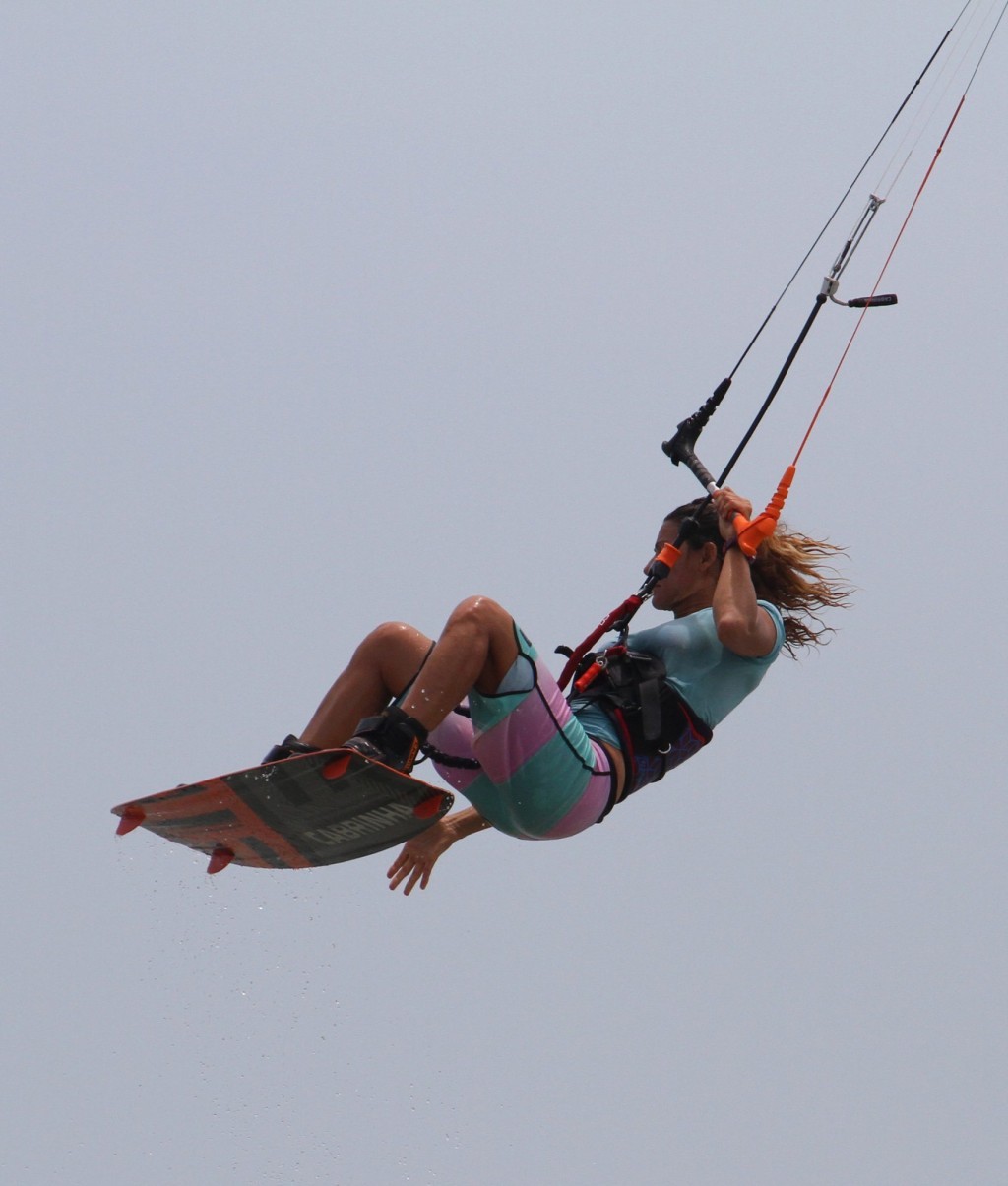 Here’s your absolute goal. Reaching the grab with your back hand, arm behind your leg and then stretching your back leg out to really bone it. This moment is almost a freeze frame. With your head and body still facing back you’ll have all but killed your rotation, so should hopefully be in suspended animation as you add as much style as possible. While you’re grabbing and styling don’t forget the kite. Karine still has her bar in on the sweet spot, and she’s still redirecting the kite forwards. Makes for a sweet photo opportunity:)