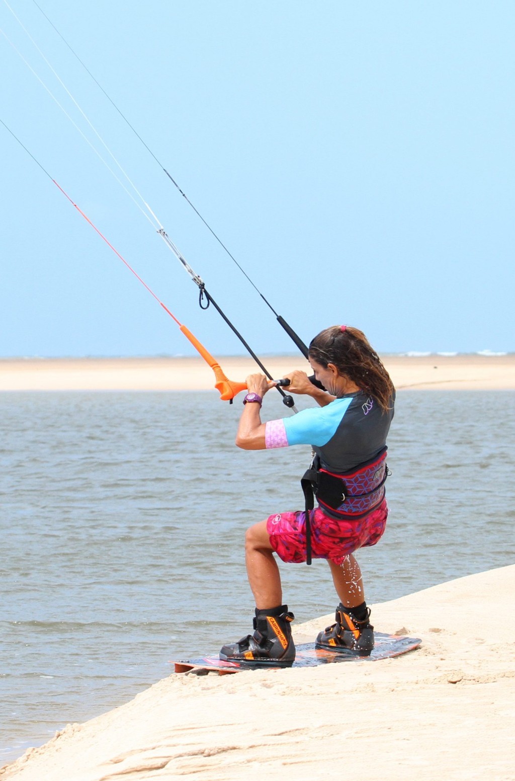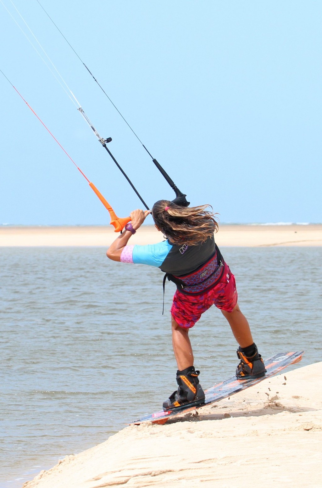 Now, this is where things start to get exciting. You’re looking to get enough power to pull you up off the beach and get you away into the water, with enough time in the air to complete a cheeky front roll. Anyone who has tried a beach start will vouch that you’ll need to give it more beans than you think is sensible. Without getting to theoretical, the reason for this is that you’re standing still and as such your kite won’t be pulling as much as when you’re blasting along. Give the kite a hefty send forwards to generate enough power. It’s important that you send the kite from the sweet spot. The reason is much the same as for a jump. If you just yank on the front hand the kite will stall and rather than flying up and over; it’ll cut the top off the window and pull you downwind. So use two hands, push and pull, to get it moving quickly, and where you want. As the kite moves you need to resist the power, so drop your weight back and low against the pressure in your harness. This will help put tension on the lines and increase the lift you’ll get. It’s very tempting to let the bar out as you feel the kite pull, but giving away all that energy won’t do you any favours. You can see how Karine has given the bar a positive send with both hands, she’s dropped her weight into a sitting position and is pivoting the bar around the sweet spot.