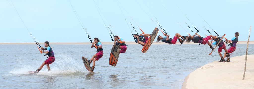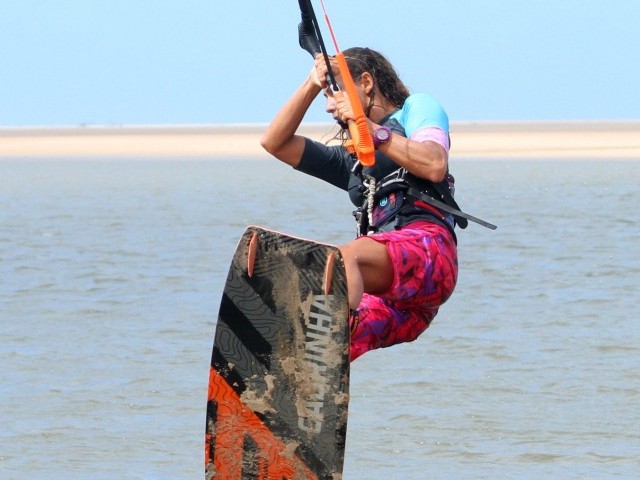 As with so many moves, this moment of take-off will pretty much dictate whether you make it or you don’t. Your objective is to get yourself forwards and pop up off your front leg. This combined with the kite will get you rotating into your front loop. With the kite pulling her up Karine launches forwards, she extends her back leg, which rocks her onto the front of the board. Then she stamps off her front foot, which should be enough to initiate her rotation. Commitment is the key here, as you will feel the kite pulling you forwards, as opposed to up and back as per a sent front from the water, which could encourage you to bail. But have faith in your movements, and you’ll soon be up and off.